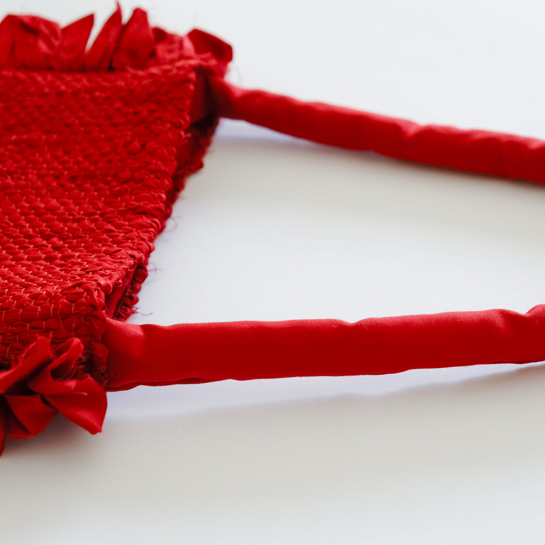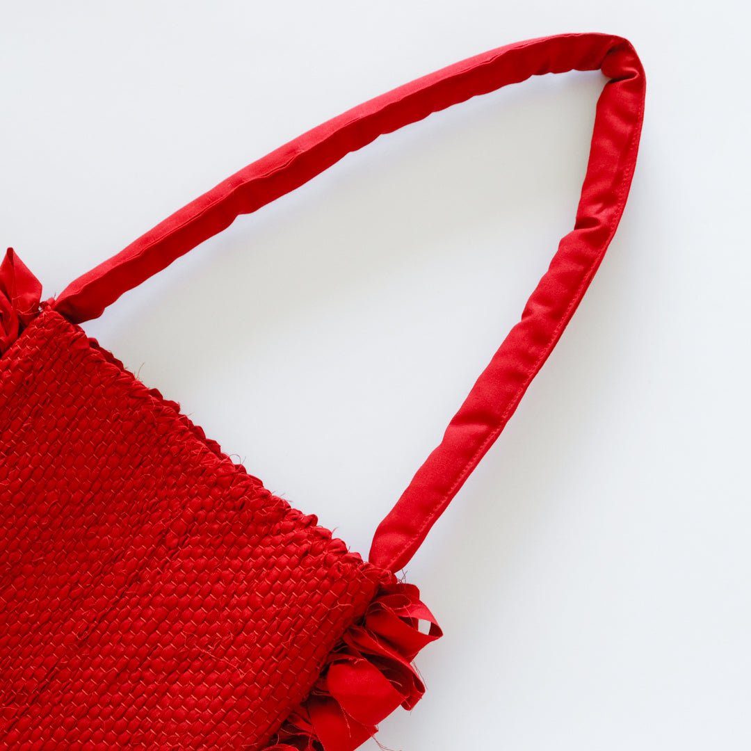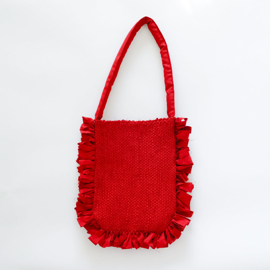 バッグ部分はしっかりと織った裂き織りでつくられ、織り目の凹凸から生まれる表情が鮮やかな赤でも強くなりすぎず上品な印象。