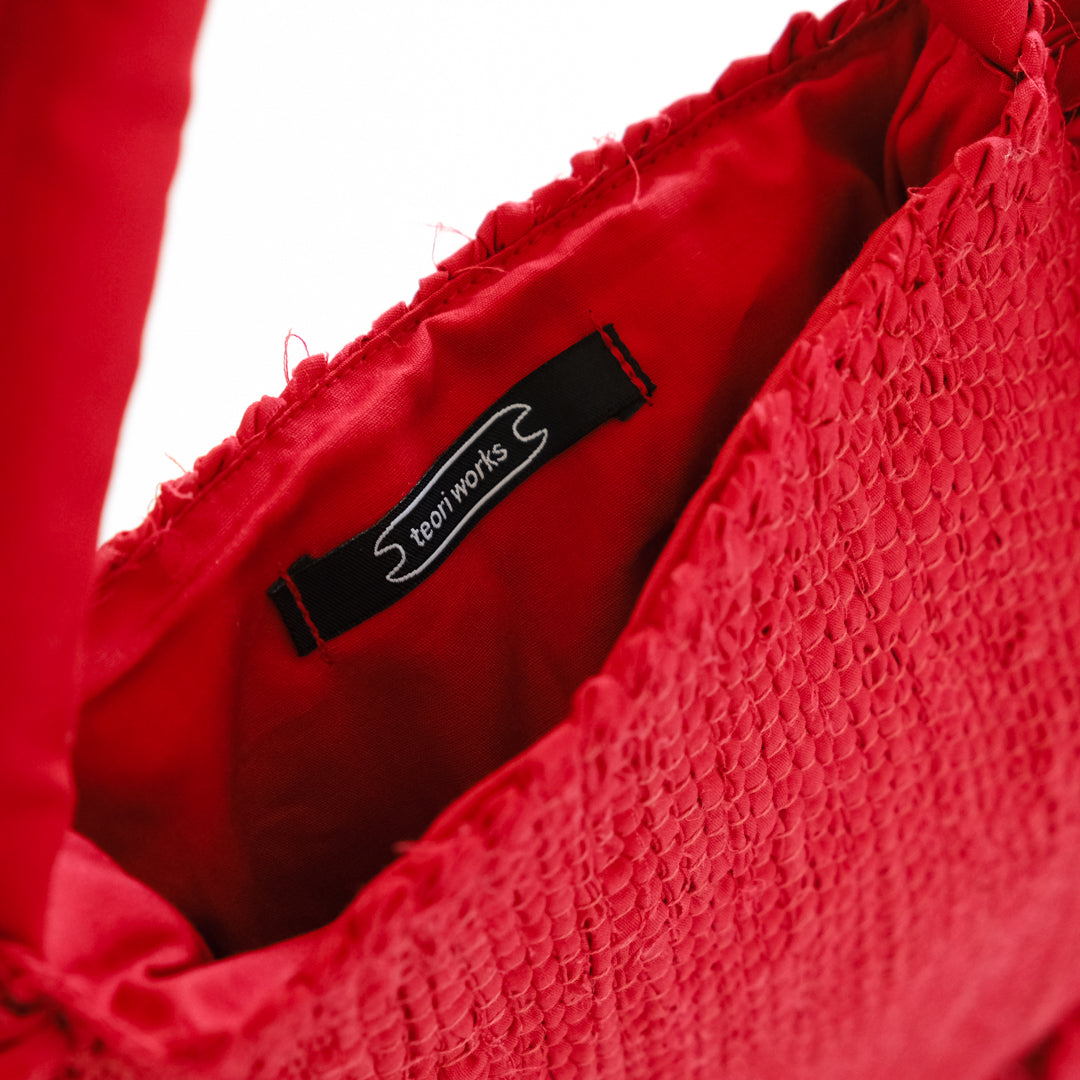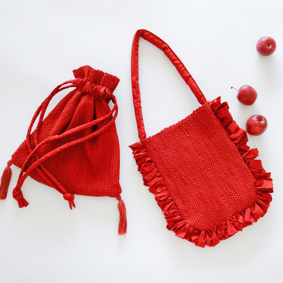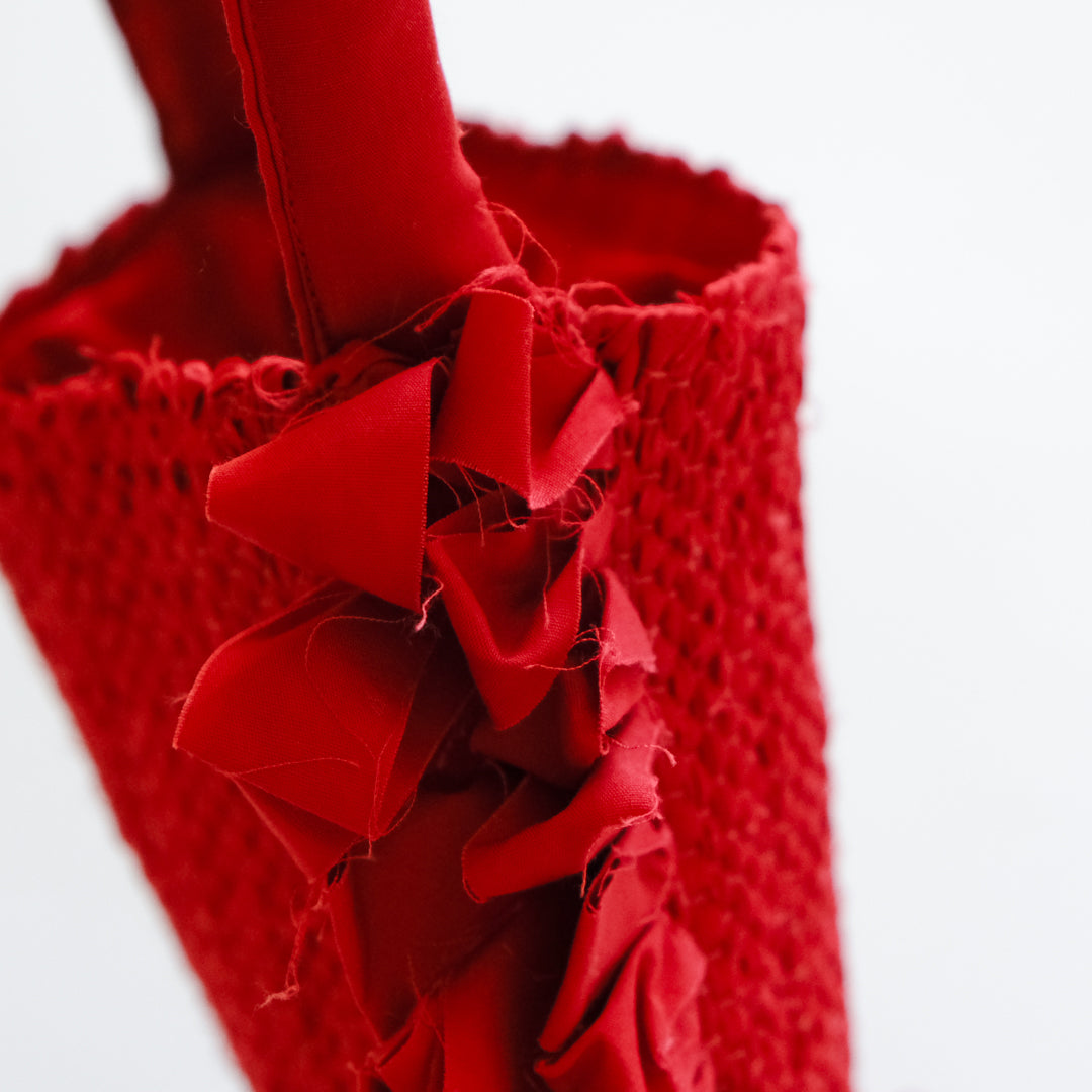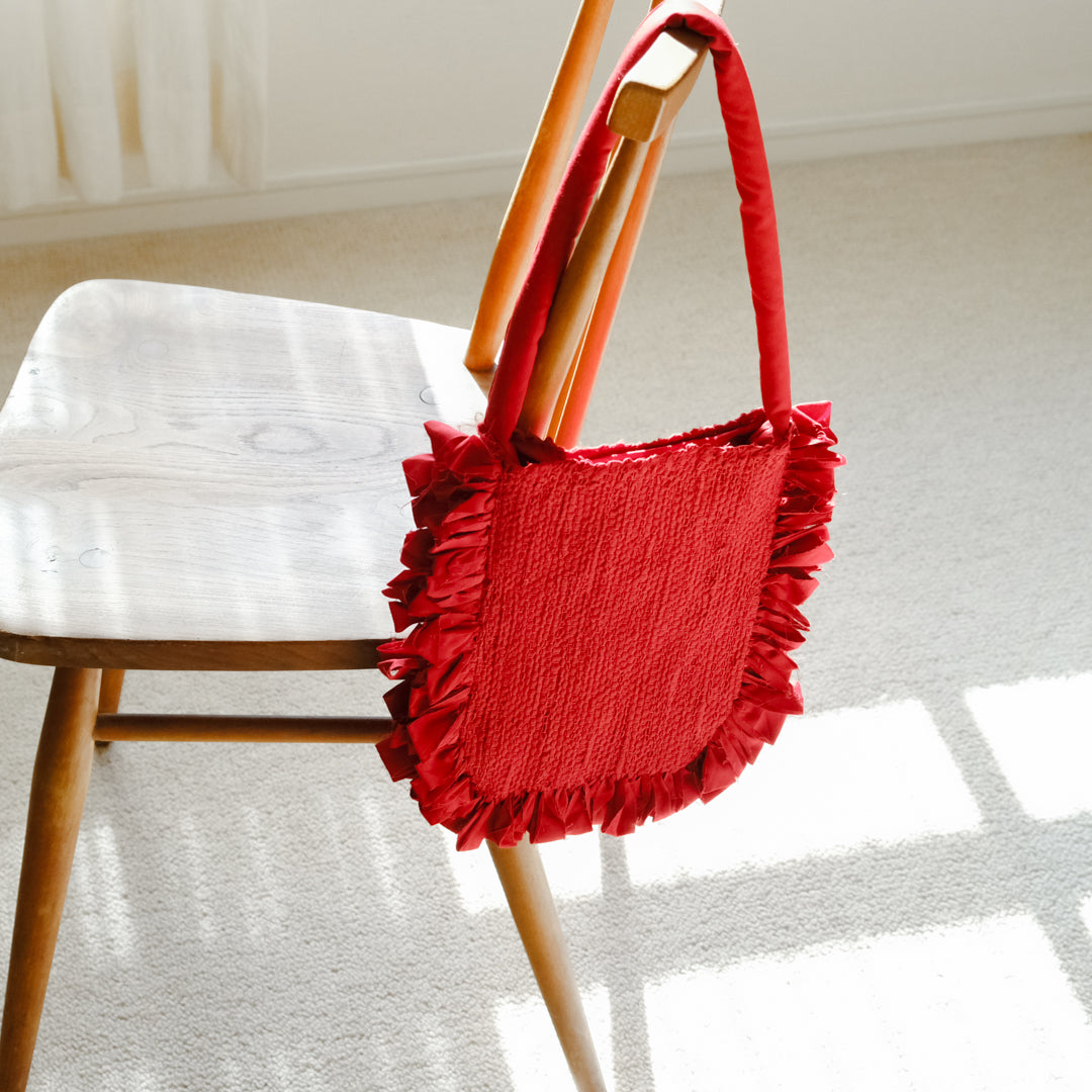 バッグ部分はしっかりと織った裂き織りでつくられ、織り目の凹凸から生まれる表情が鮮やかな赤でも強くなりすぎず上品な印象。