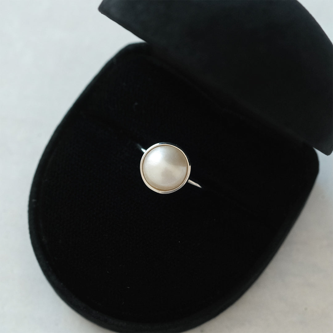 こちらのリングは、マベパールの半円形を生かしたボリュームのあるデザインです。コロンと丸いかたちが優しい雰囲気に見せてくれます。