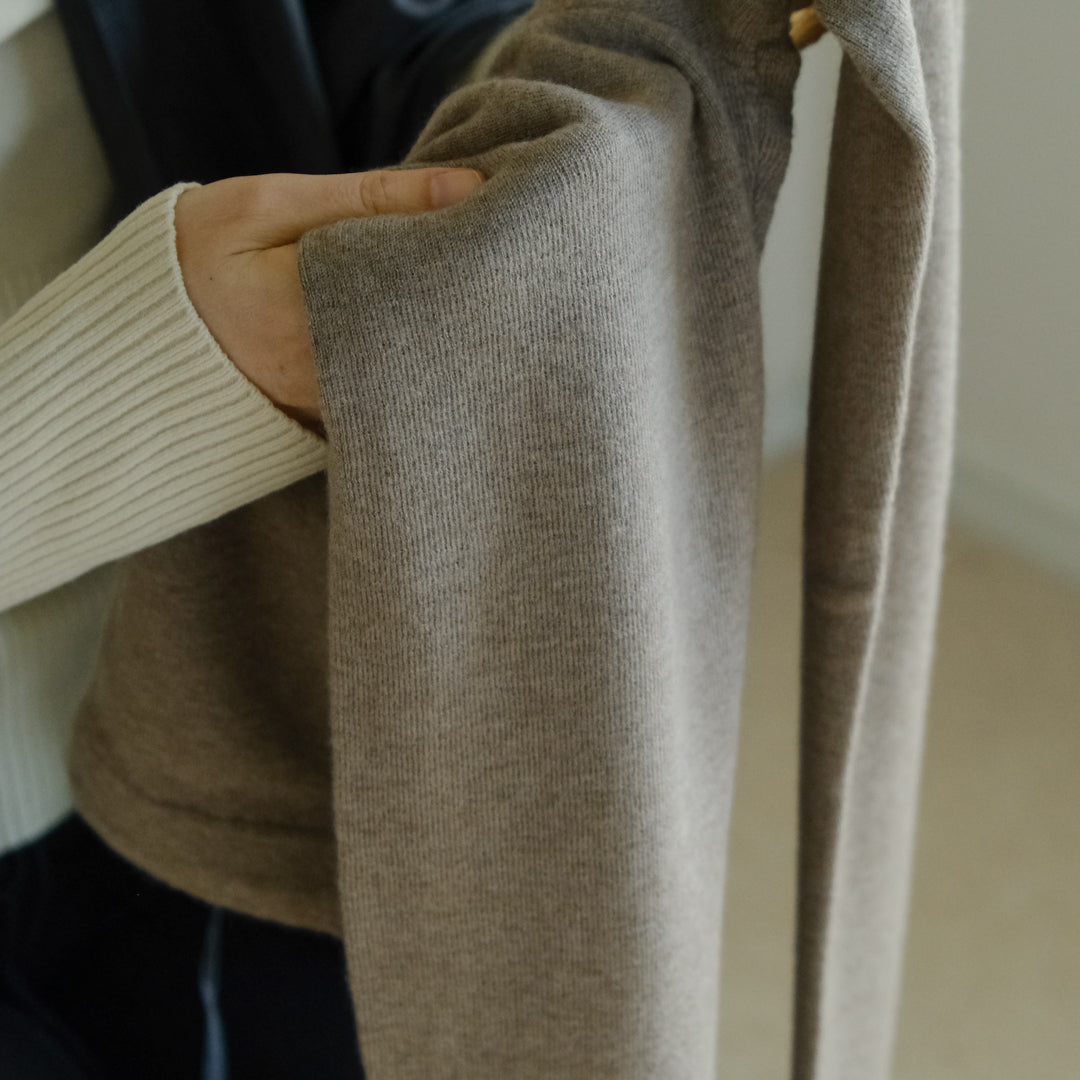 厳選したカシミヤを、極細のリブで織り上げた生地はとろけるような肌触り。ぴたっとやわらかくフィットします。