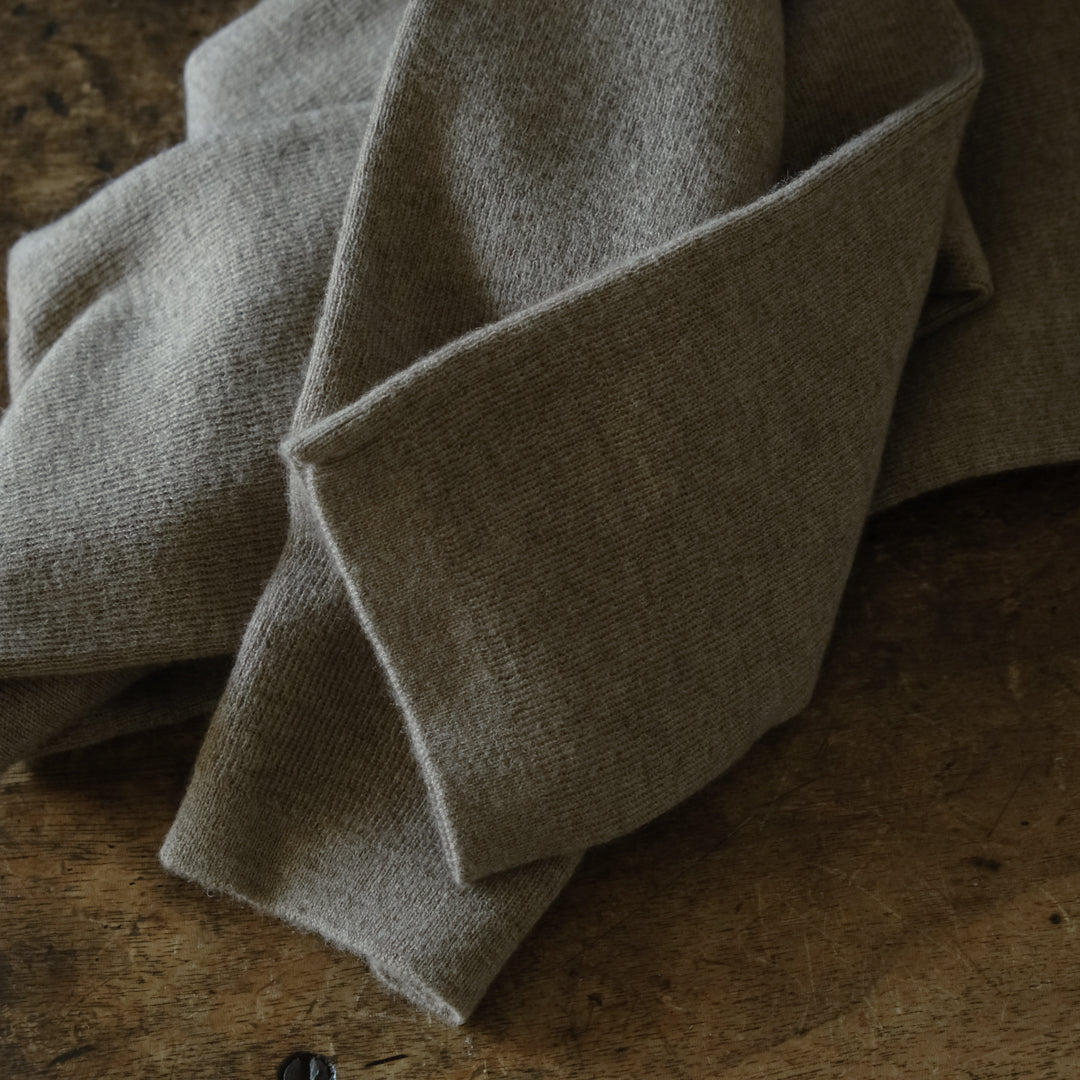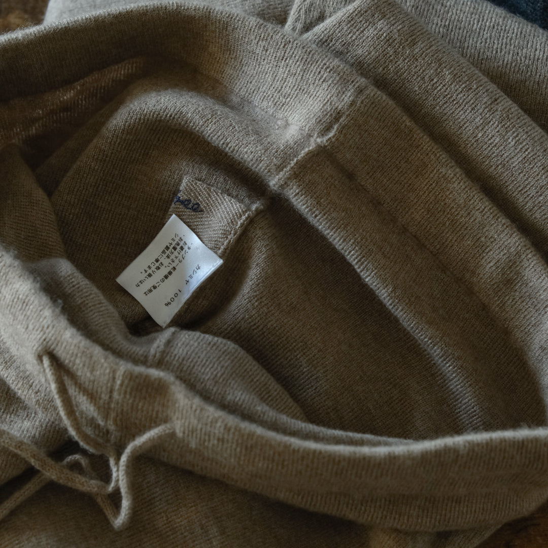 カシミヤらしい手触りや風合いになるよう、原毛の仕入れから、紡績、縮絨、ニットに編み上げるまで、全て見える工程で、一貫して行っています。