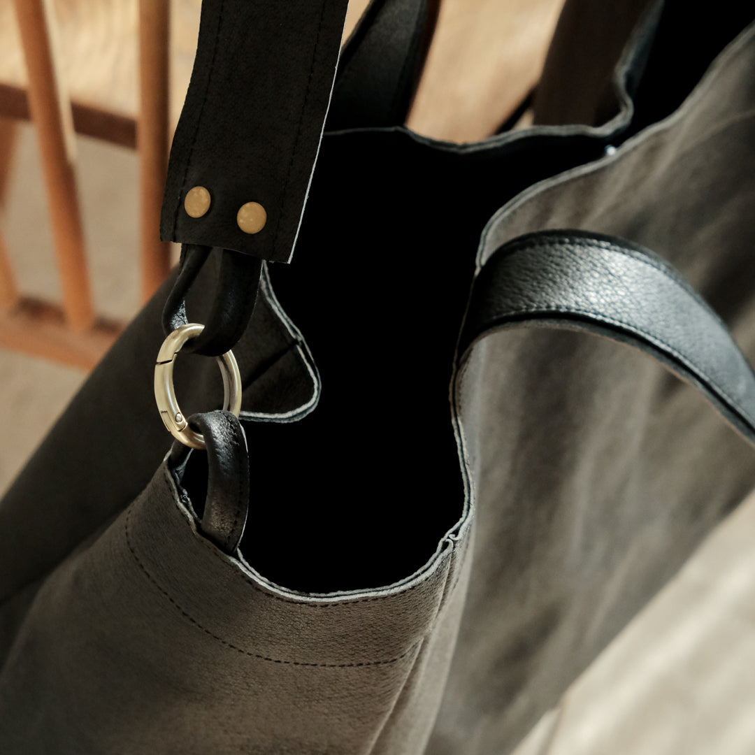 肩紐はカラビナで取り外し可能、荷物の重さや装いに合わせて持ち方が選べます。