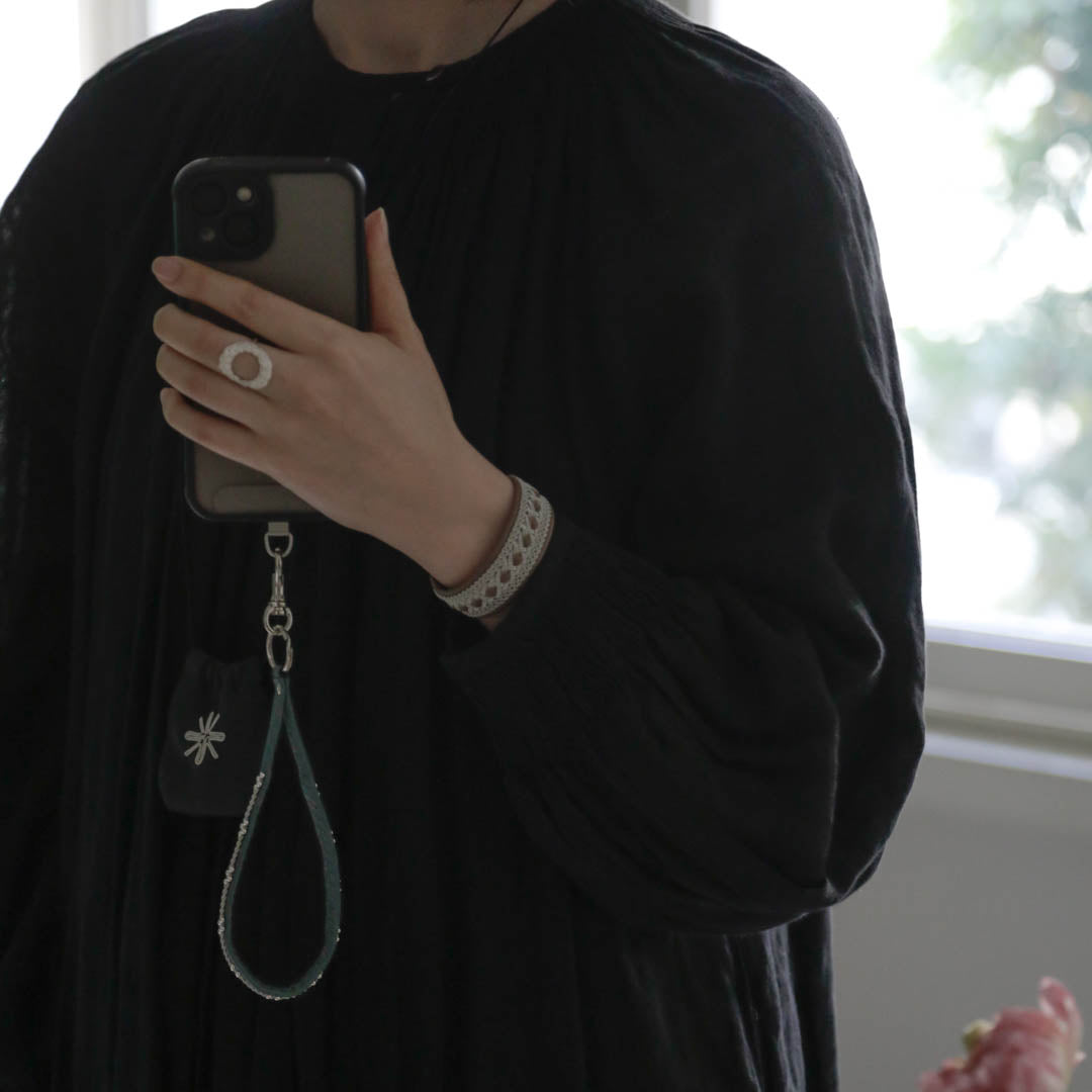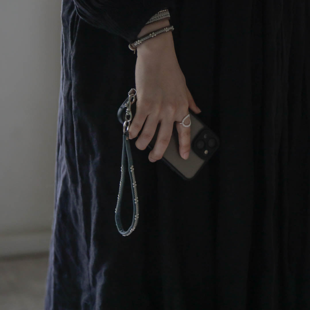 素材:トナカイ革、ピューターワイヤー、洋白、シルバーサイズ:リング約2cm、ストラップの長さ約15cm、巾約0.8cm・すべてハンドメイドでつくられた1点ものですので、サイズに多少の誤差があります。・大量の水分は劣化の大きな原因となります。