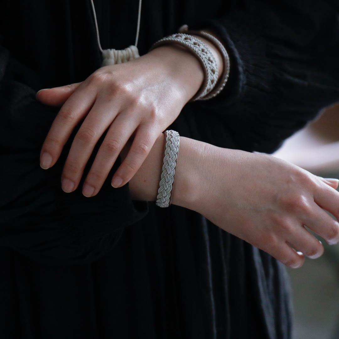 このページでご紹介している「BRC015」は、ベーシックな四つ編みのデザイン。3本取りのシルバー糸で丁寧に編み上げました。
