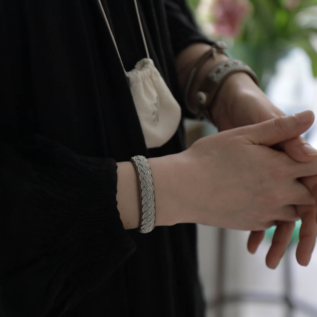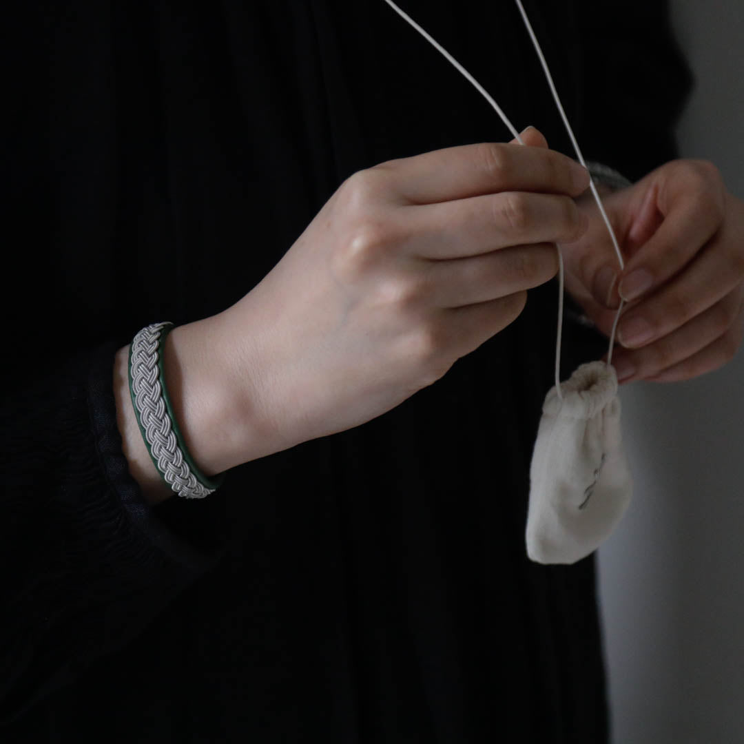 北欧の先住民サーミ族による伝統を取り入れた、YOHEI NOGUCHIのサーミブレスレットをご紹介します。シルバー糸を3本取りで丁寧に編み上げた、すっきりとした四つ編みのデザイン。さりげない輝きが手元に静かな存在感を添えてくれます。