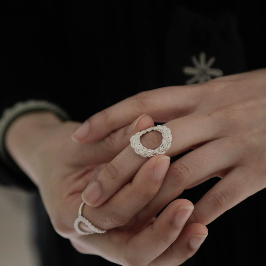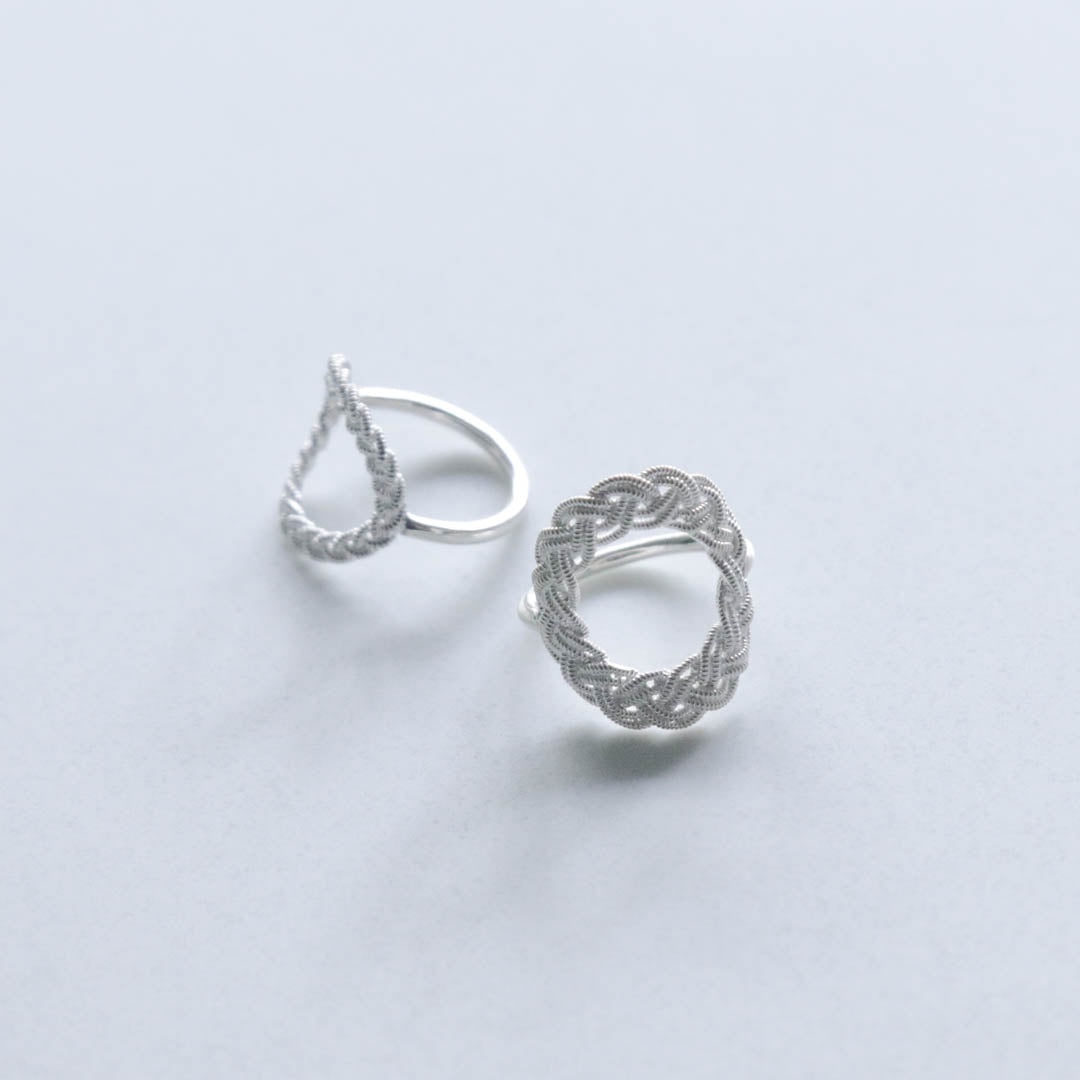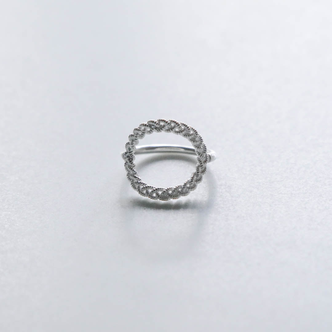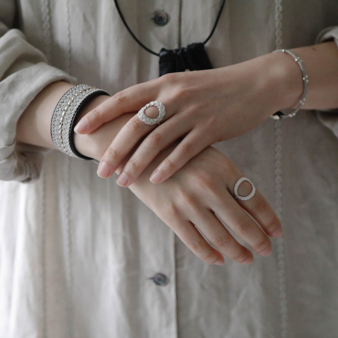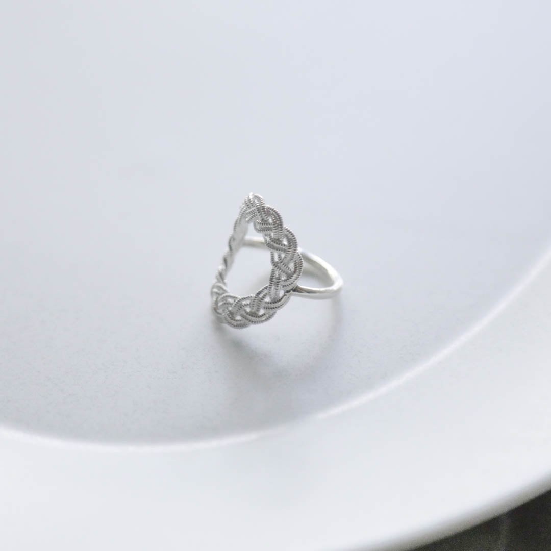 ピューターワイヤーの素材感だけでなく、編み模様の隙間までシルバーで表現された立体的な指輪。