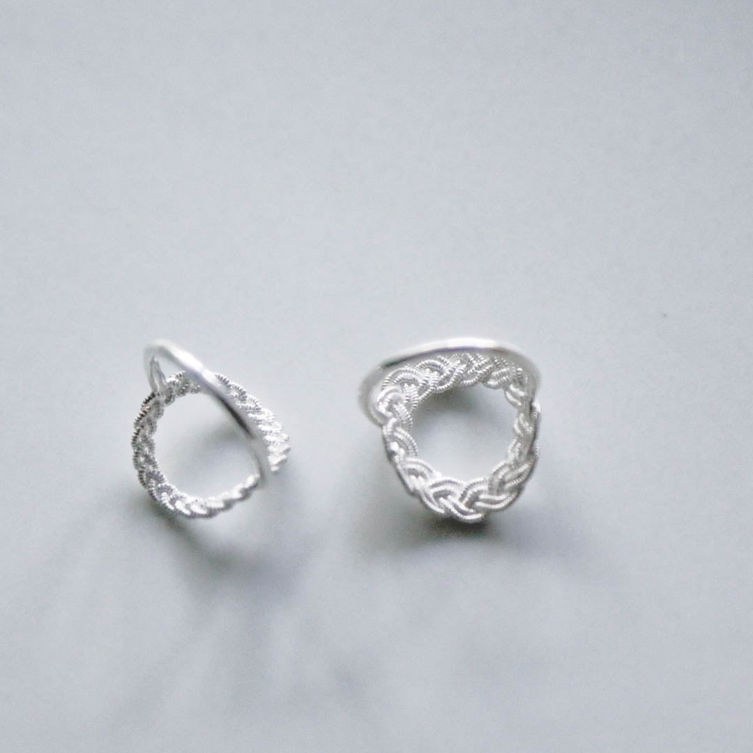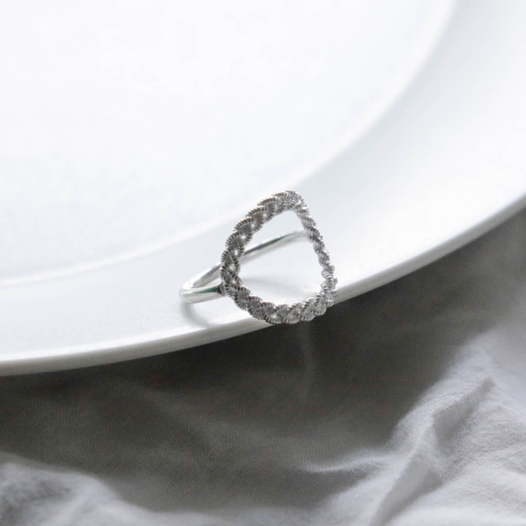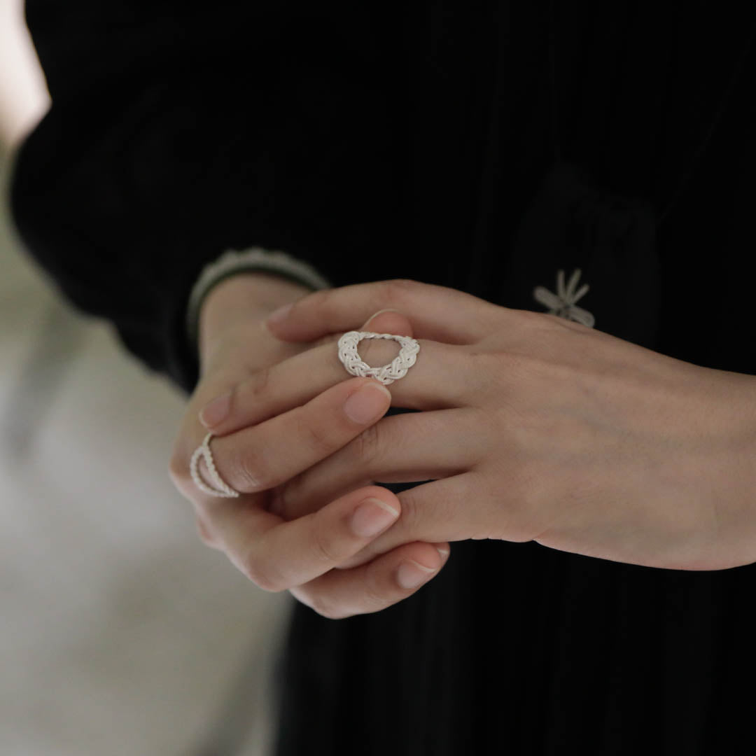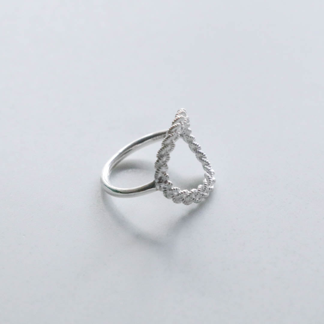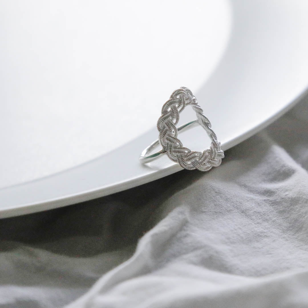 ピューターワイヤーの素材感だけでなく、編み模様の隙間までシルバーで表現された立体的な指輪。