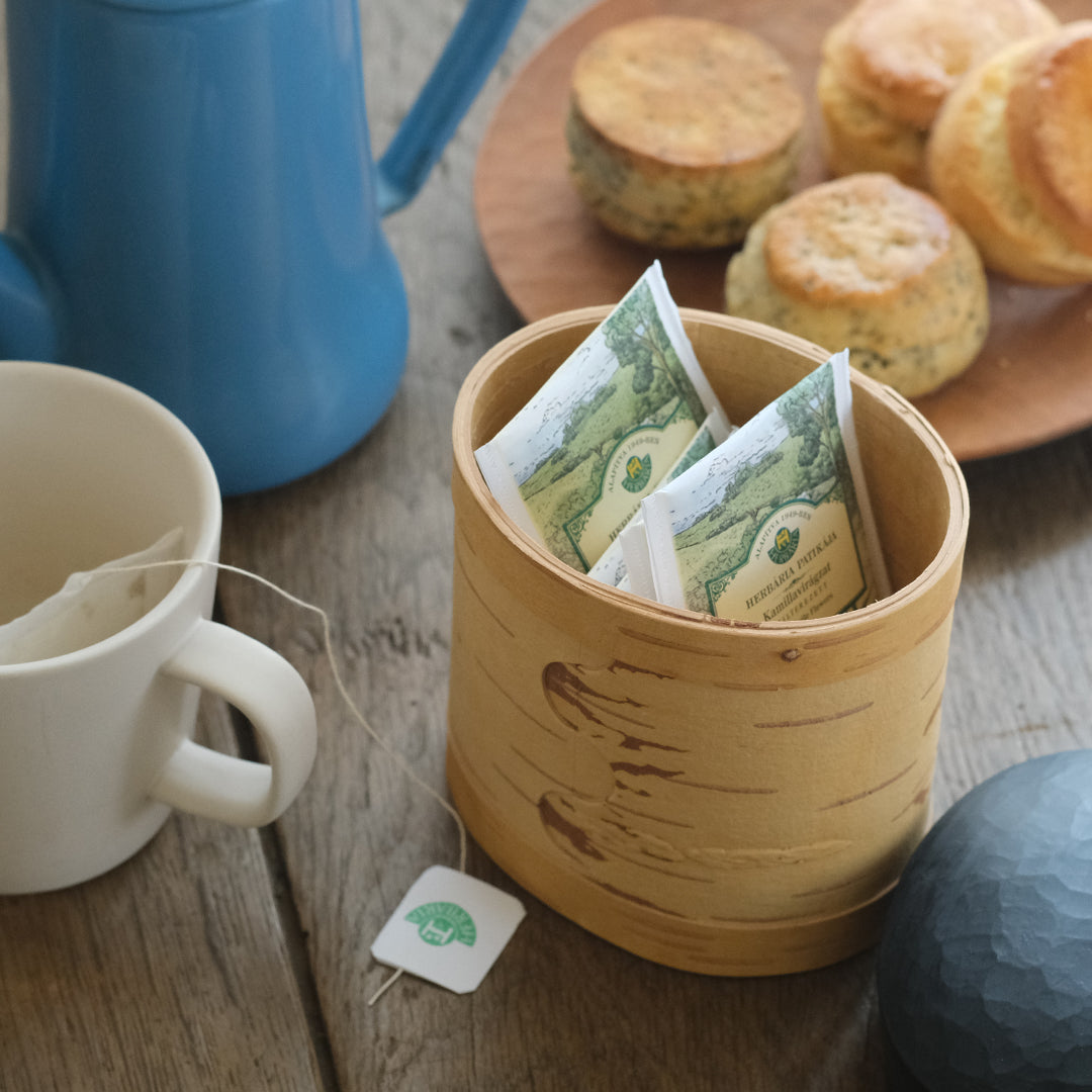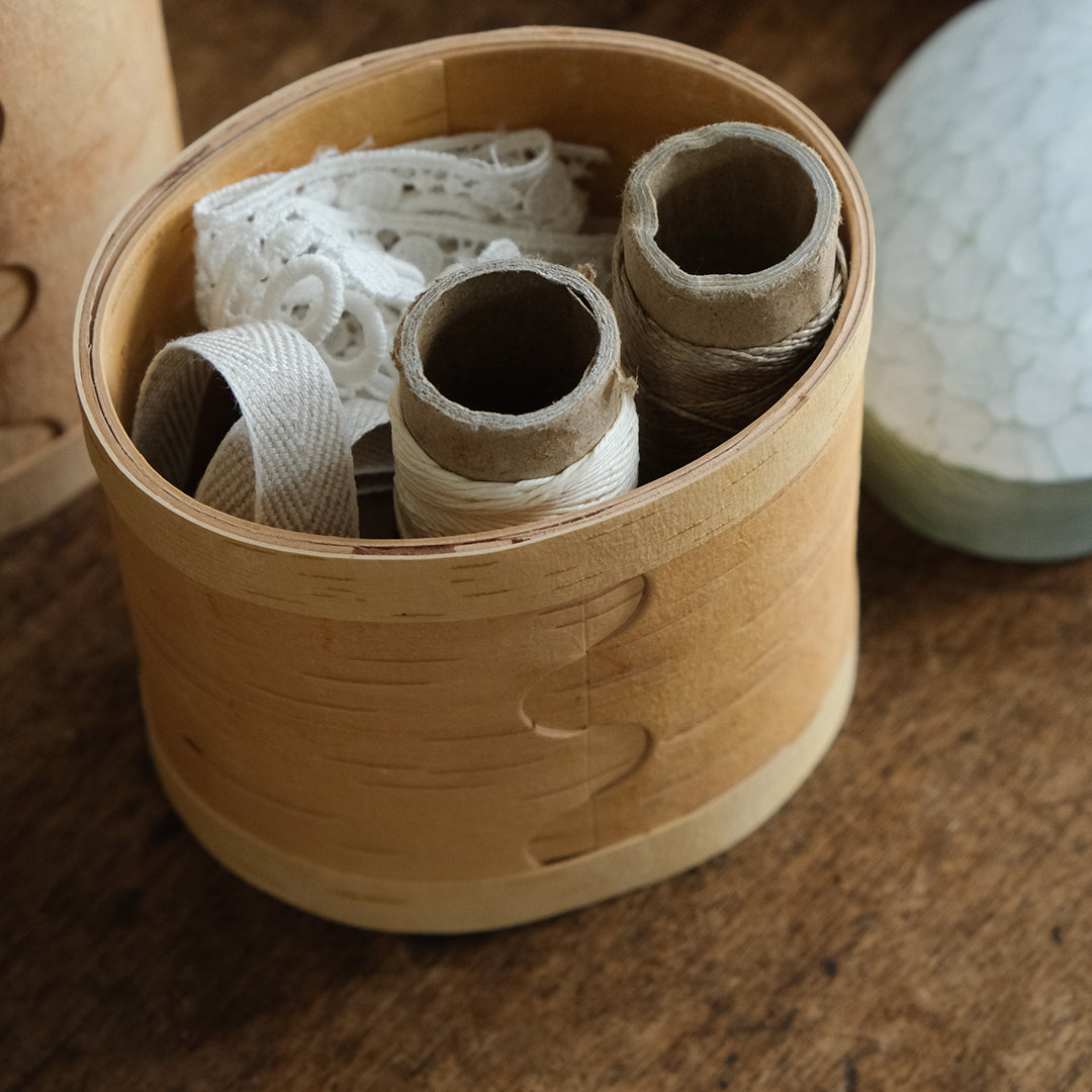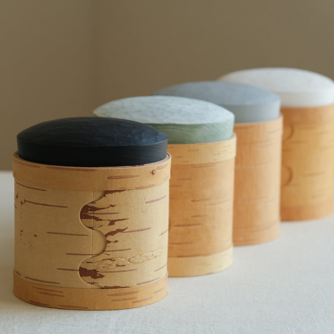スウェーデンの古くからの生活を伝えるように、伝統的な技術で白樺のかごをつくる迫田希久さん。カラフルな蓋のキャニスター「Burk」シリーズより、中サイズをご紹介します。