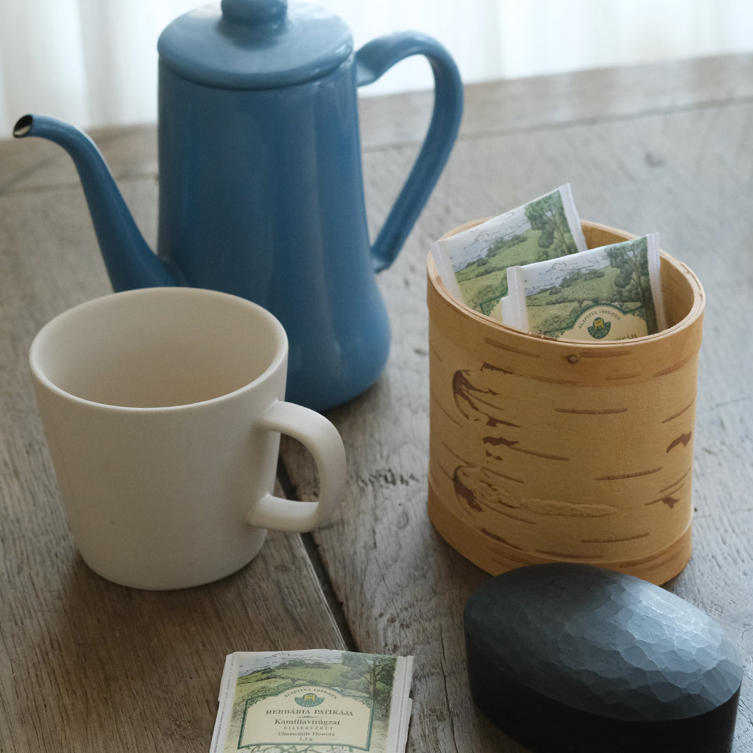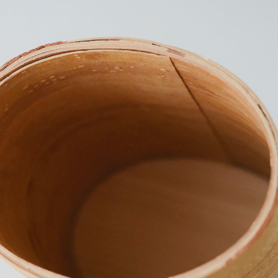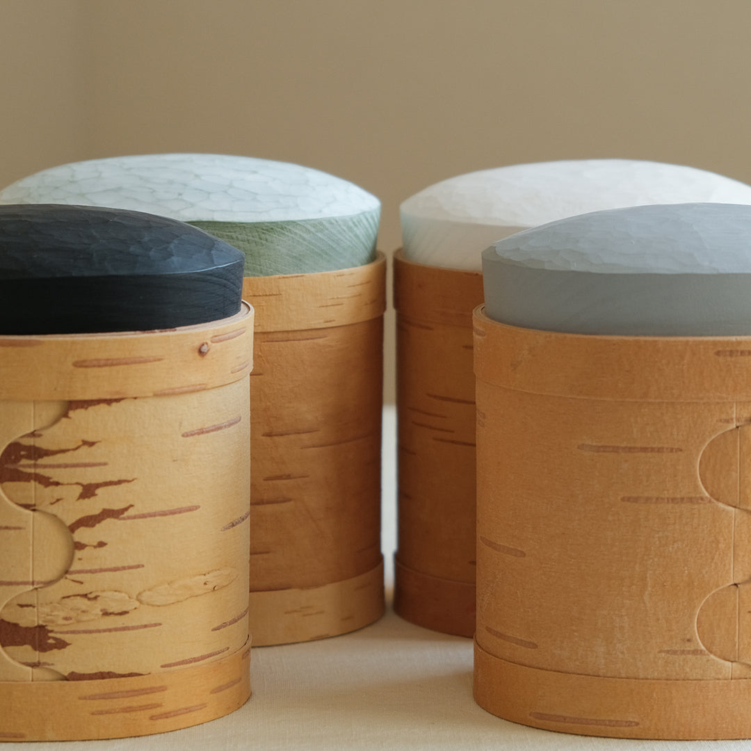 スウェーデンの古くからの生活を伝えるように、伝統的な技術で白樺のかごをつくる迫田希久さん。カラフルな蓋のキャニスター「Burk」シリーズより、中サイズをご紹介します。