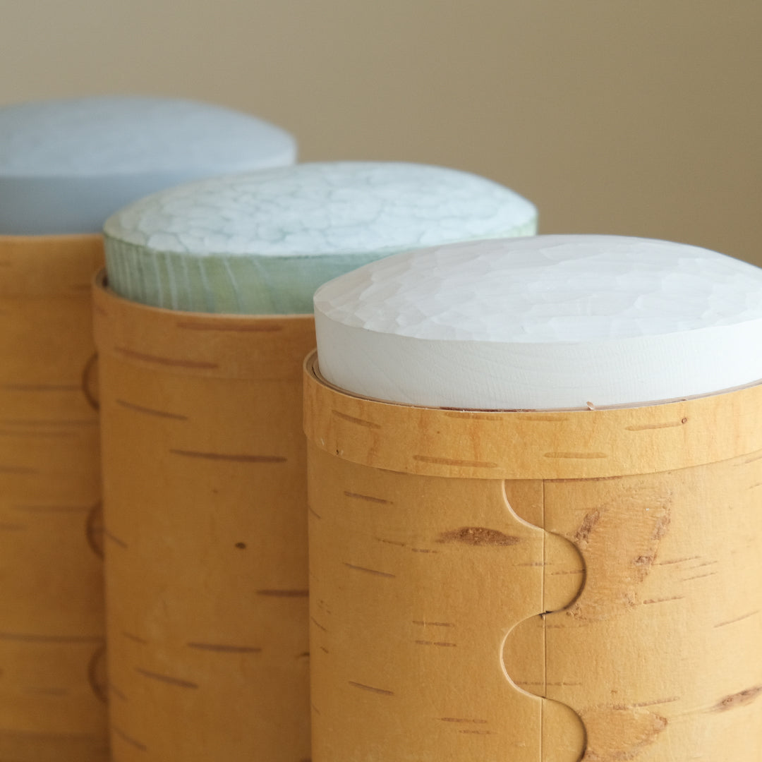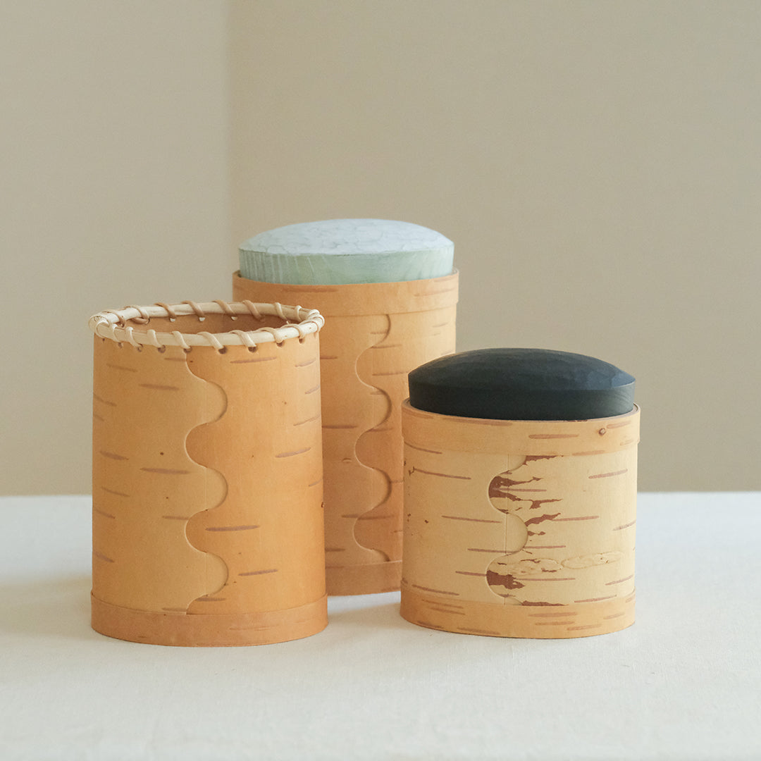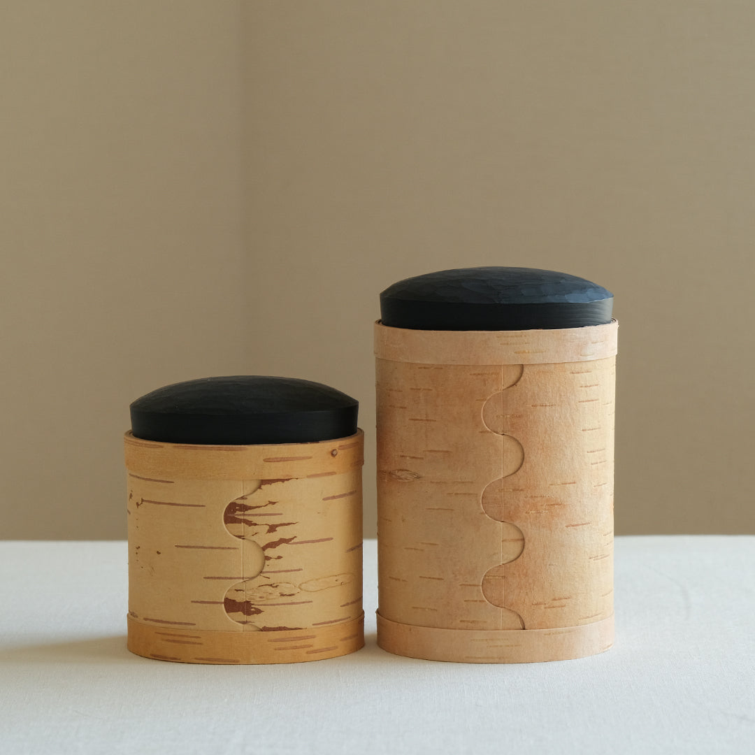 はっとするような色の蓋が目を引くキャニスターは、白樺の樹皮と松の木でつくられています。