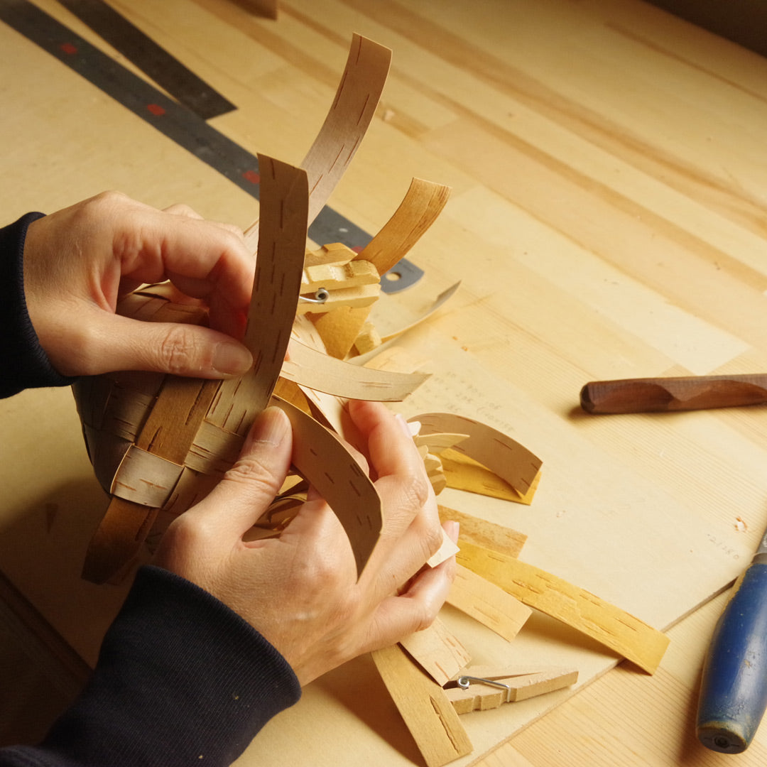 丸い刃物で形づくったパーツを、光が透過するまで薄く削ぎ落してはめ込みます。外側と内側、計2枚の樹皮をくるりと合わせて。