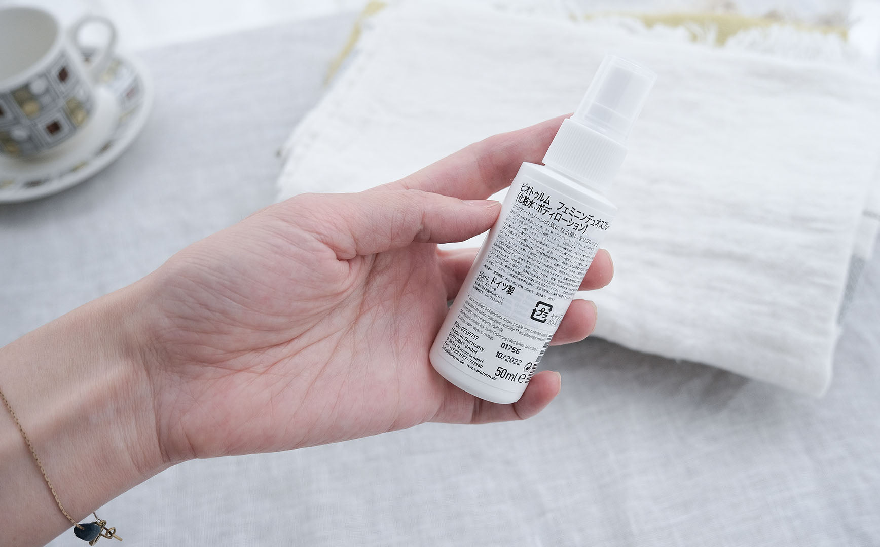 フェミニンデュオスプレーは、清潔にしておきたいデリケートゾーンの拭き取りに。スクワランとホホバ種子油も配合されていて、うるおいのある肌へと導きます。