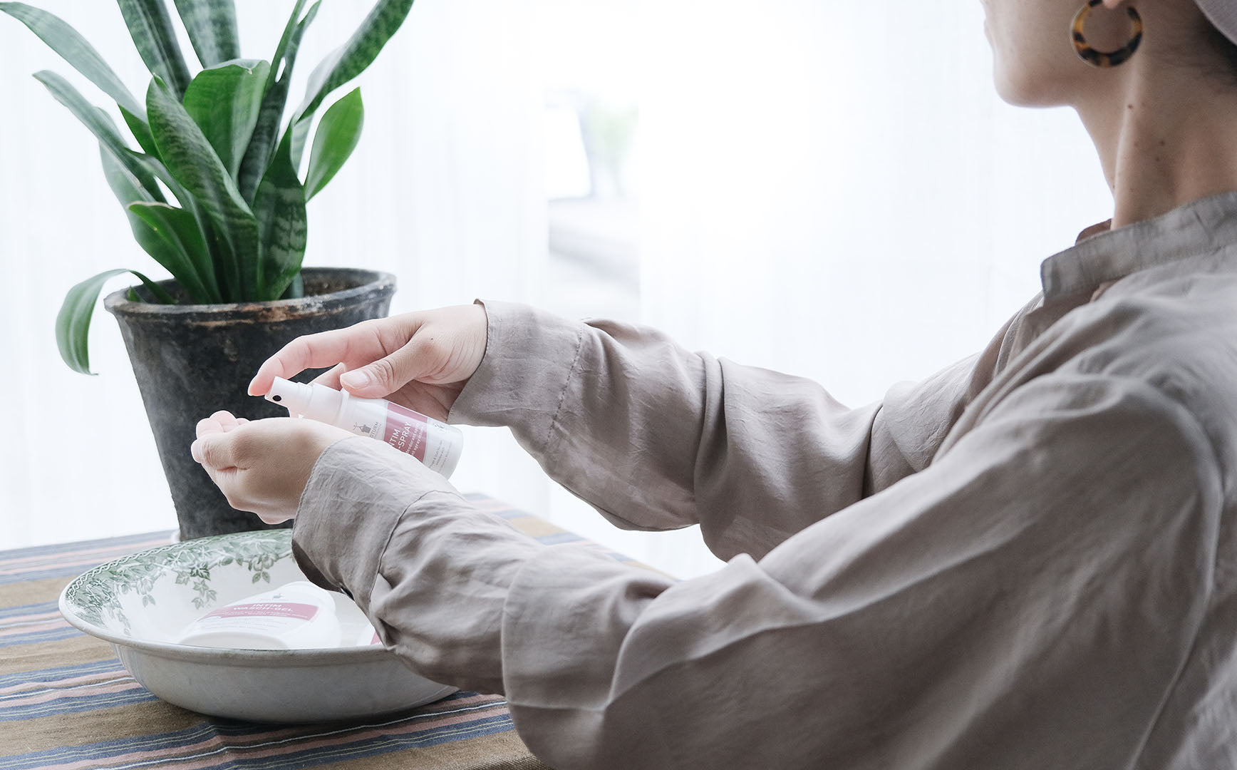 また、生理中などにおいが気になった時にも。トイレの後などに布やコットンにスプレーし、気になる部分のふきとりにお使いください。