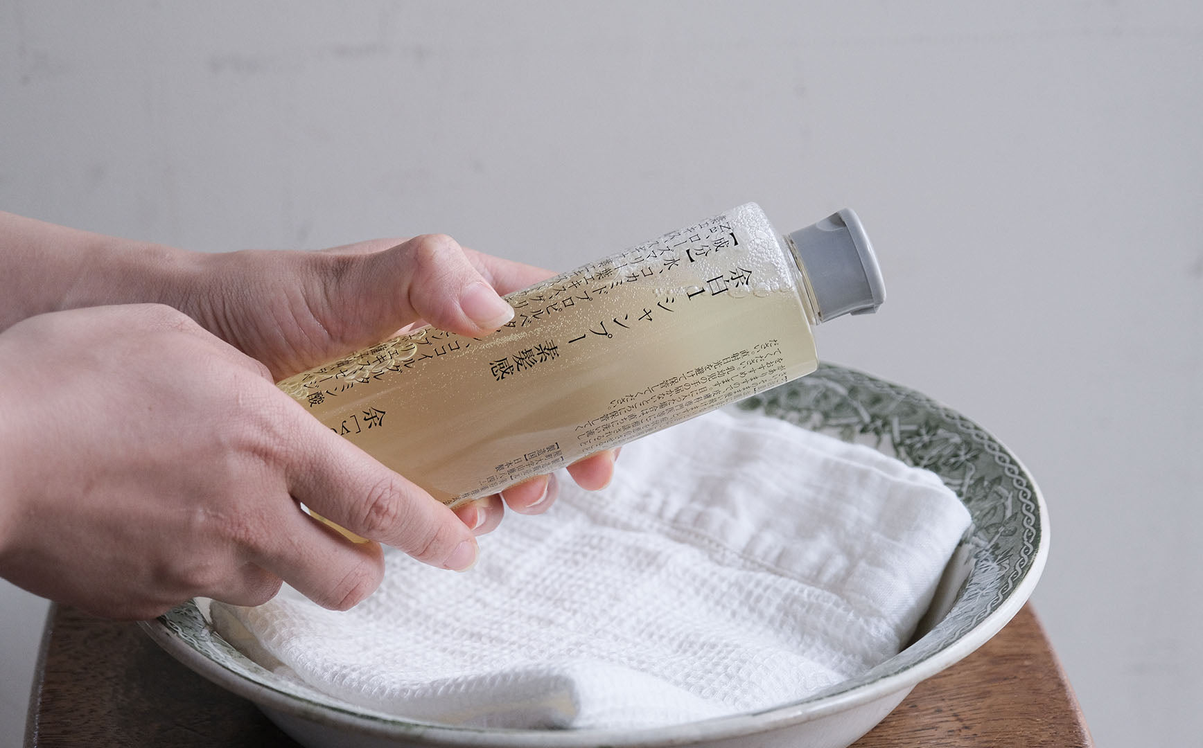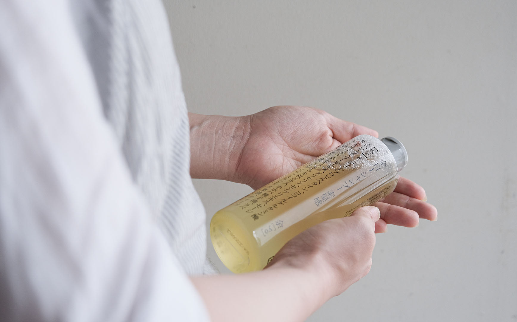 成分だけが記載されている潔いデザインのボトルは、トライタンという飽和ポリエステル樹脂製。哺乳瓶用に開発された素材で、環境ホルモンの溶け出しが99.7%抑制される、現時点で人の身体や環境にいちばんやさしい素材なのだそう。