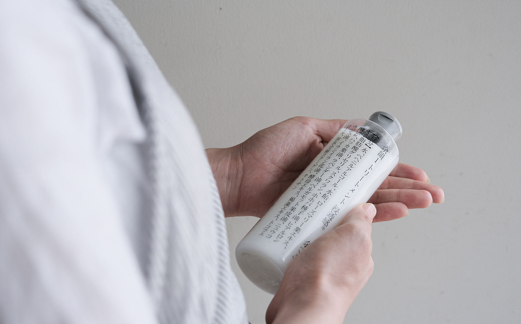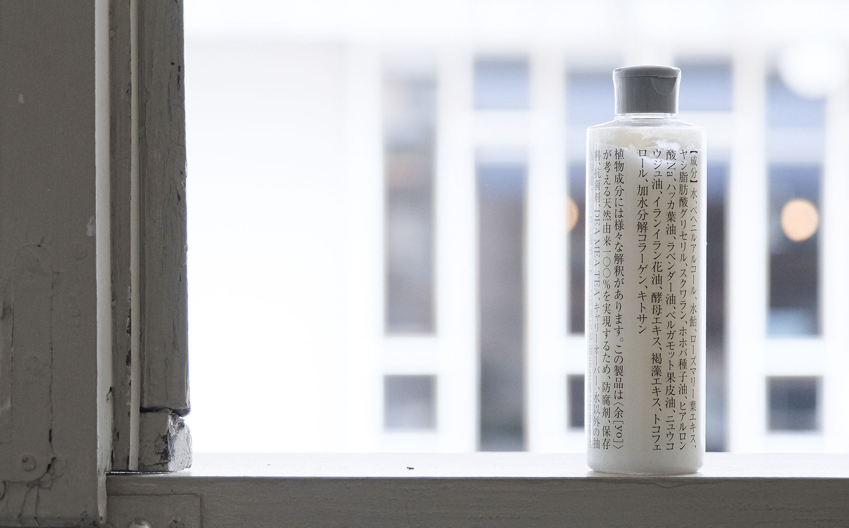 成分だけが記載されている潔いデザインのボトルは、トライタンという飽和ポリエステル樹脂製。哺乳瓶用に開発された素材で、環境ホルモンの溶け出しが99.7%抑制される、現時点で人の身体や環境にいちばんやさしい素材なのだそう。