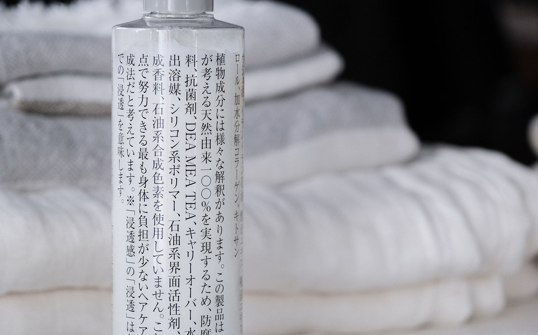そのかわり、水以外の抽出溶媒やシリコン系ポリマーといったケミカルな成分は使われていません。防腐剤や保存料も不使用、余計なものはそぎ落とし頭皮と髪が必要とするものだけでつくられています。