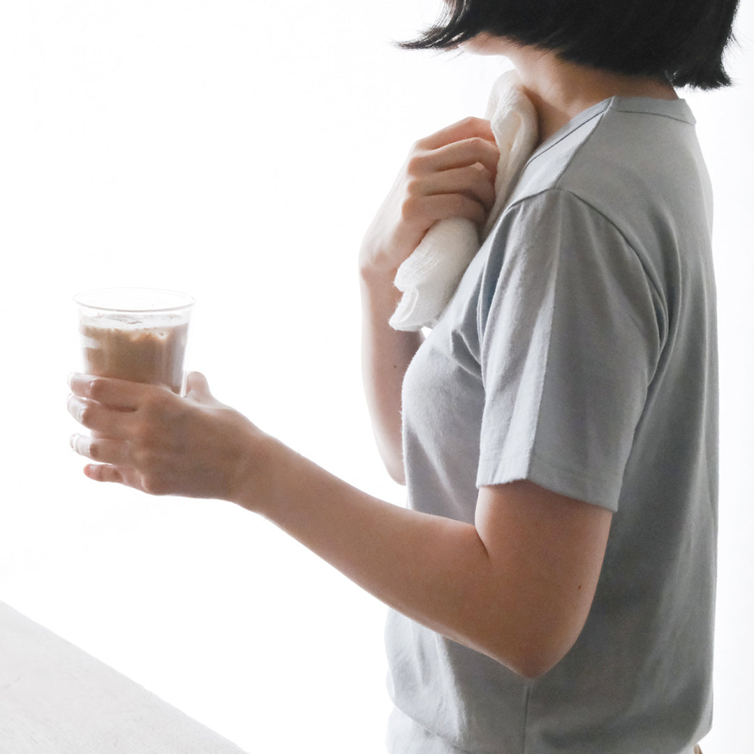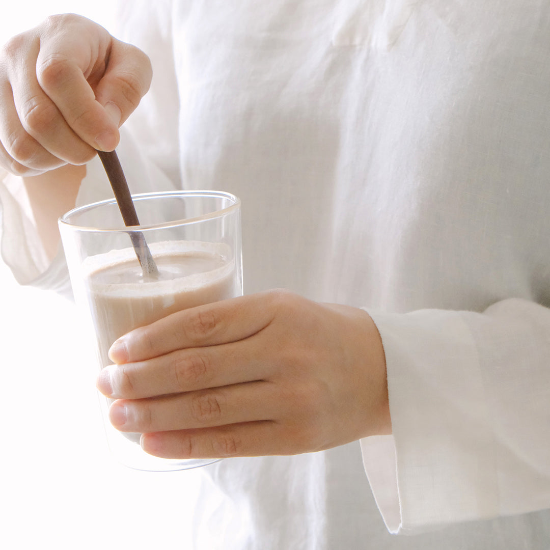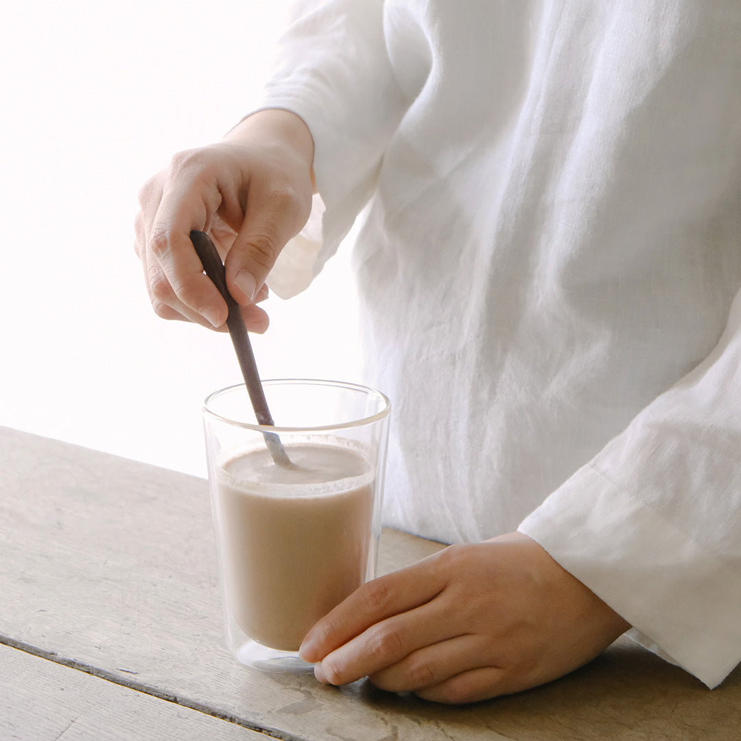 粉がきめ細かく溶けやすいのもうれしい特徴。スプーンでかき混ぜるだけでつくれます。シェイカーを使えば、よりなめらかな口あたりに仕上がります。