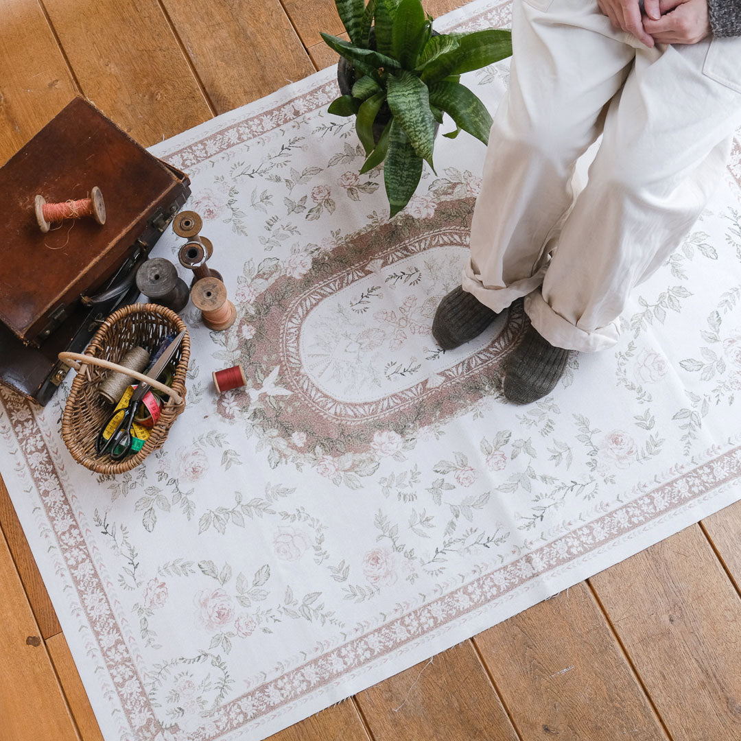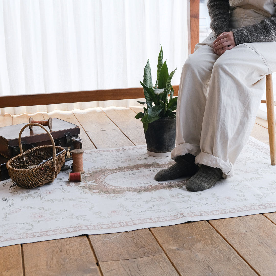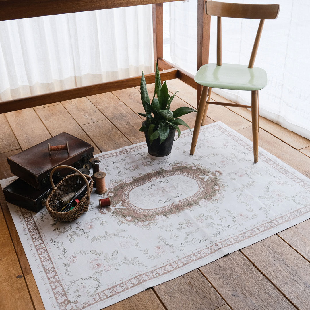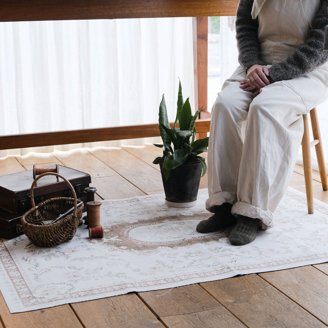 「ローズキリム ベージュ」は、バラのモチーフを入れたヴィンテージ感溢れるフェミニンな柄。淡いトーンの柔らかな雰囲気が、インテリアにも馴染みやすいデザインです。