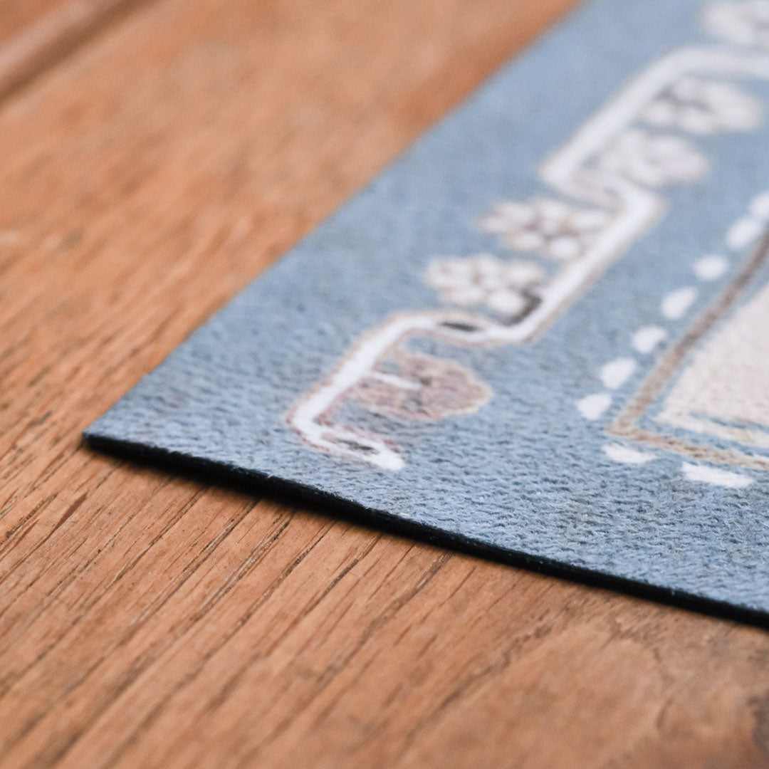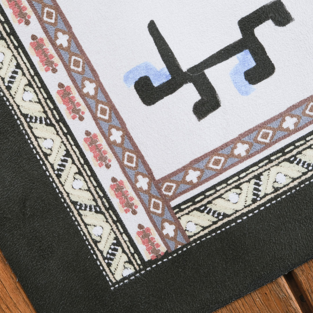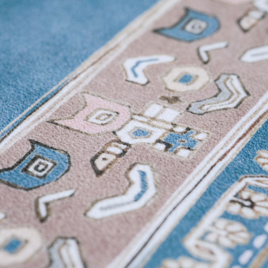 表地は心地よい肌触りのフェイクスエード。デザインだけでなく、絨毯のように起毛した素材なので、ラグ感覚でお使いいただけます。