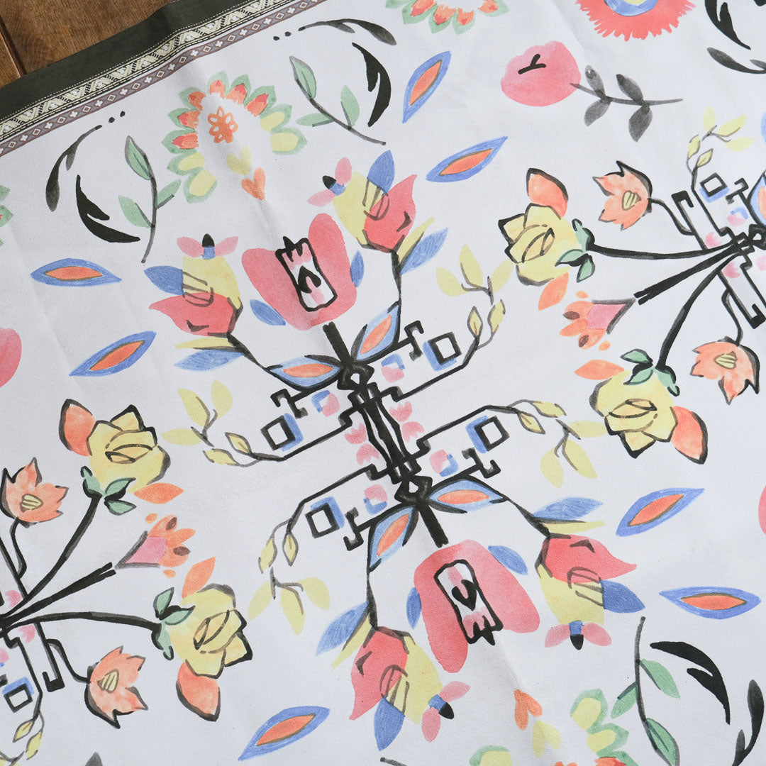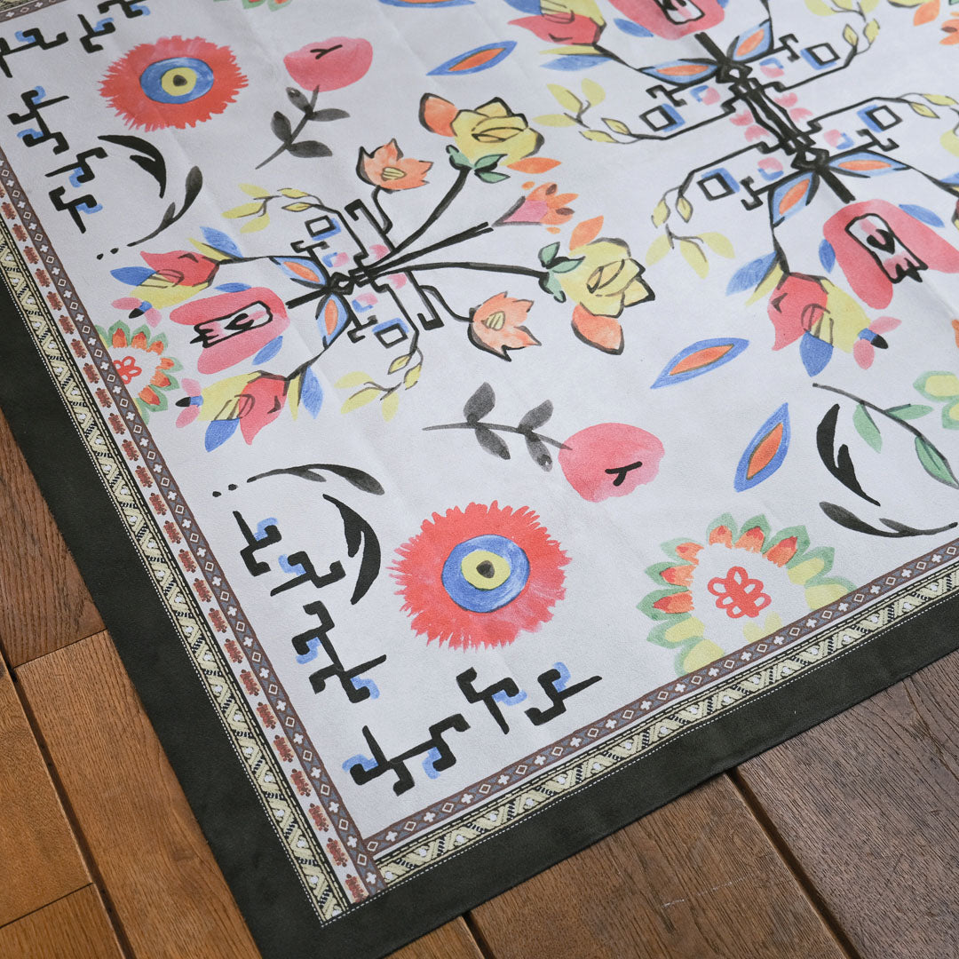 伸びやかなタッチで描かれたカラフルな花々が印象的な「オリエンタルフラワー オフホワイト」。眺めるだけで、気持ちまで明るくなるよう。