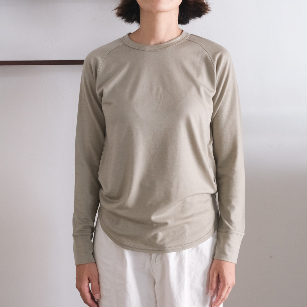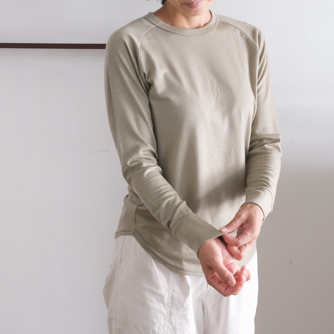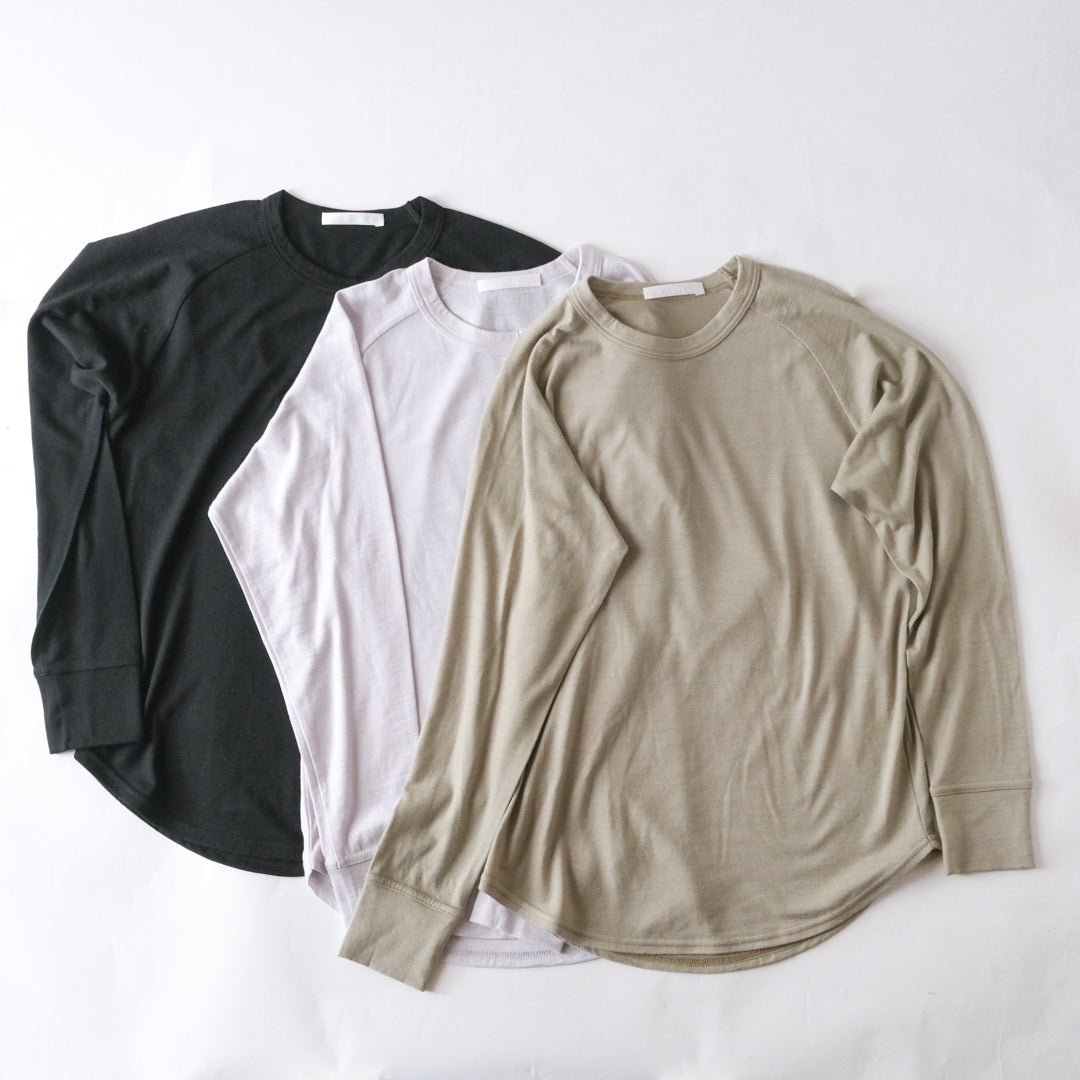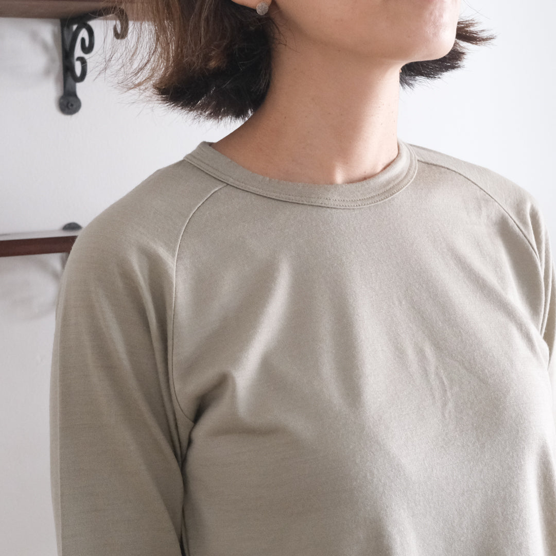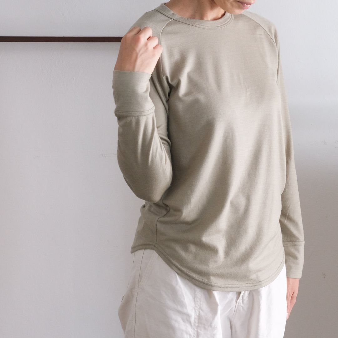 肩や腕が動かしやすいラグランスリーブなので、アウトドアやスポーツウエアとしてもおすすめ。天然の抗菌消臭機能で汗のニオイを気にせず、快適に着られます。