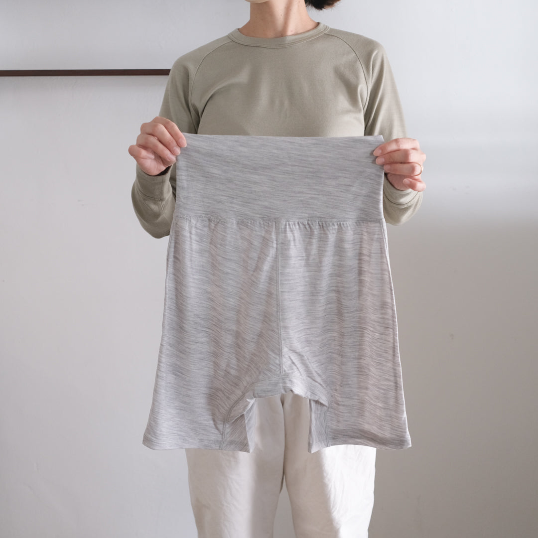 ロトシリーズのハーフパンツは太ももまで包み込む、冷え症の人にはうれしいデザイン。下の写真のように股上にクロッチがついているので、一枚履きもできます。ヒップラインにあわせた丸みのあるつくり。ゴムは使わずに、生地自体の伸縮性によってお尻を包み込み、お腹もやさしくホールドします。