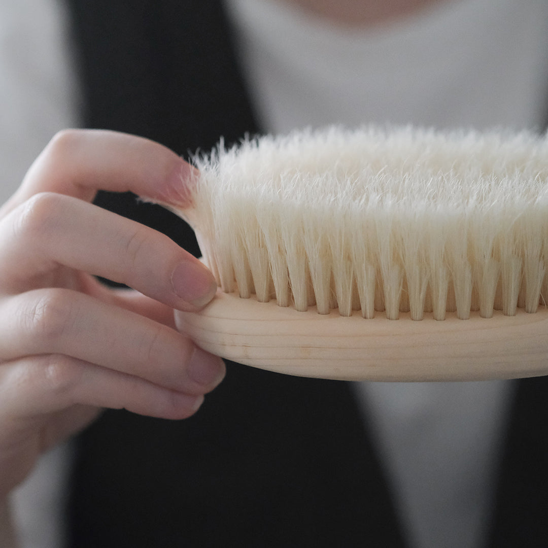 つい力が入ってしまう方におすすめしたいのが、天然毛のブラシ。ナイロンタオルに比べて、やさしい肌あたりなんです。