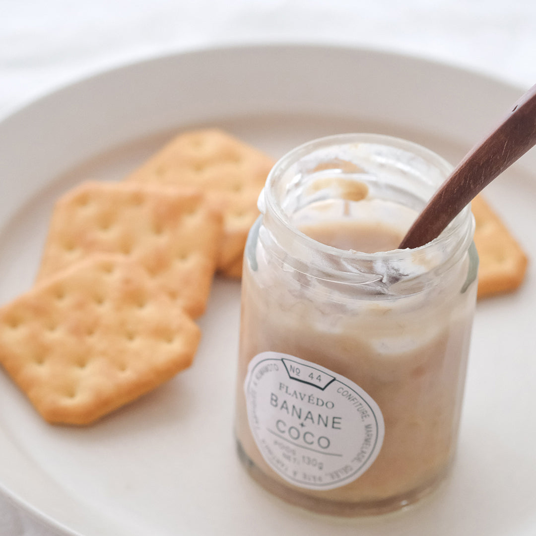 沖縄県産の島バナナとココナッツのコンフィチュール。 甘いココナッツの味わいが、濃厚でトロピカルな雰囲気です。