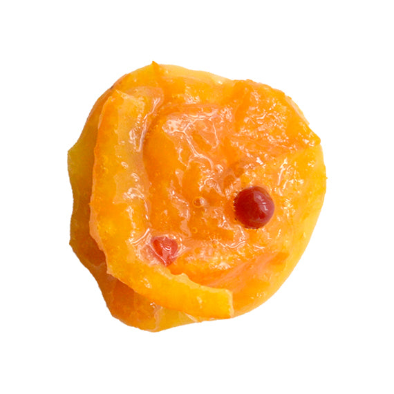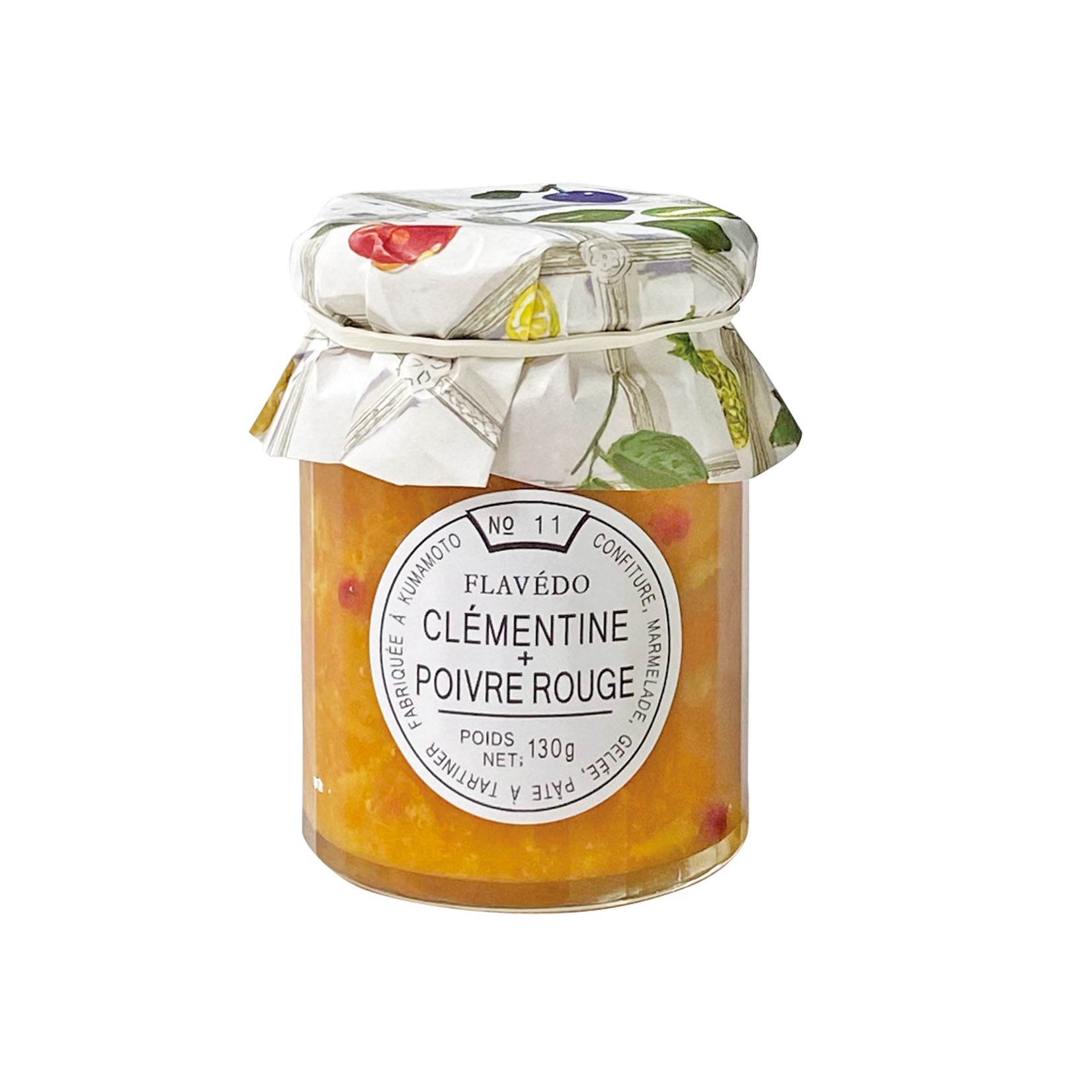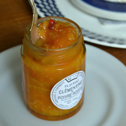 ピンクペッパーを散りばめた、にしだ果樹園の月読み蜜柑のコンフィチュール。ぷちぷちと弾けるピンクペッパーの甘い香りはチーズとも相性がよいです。