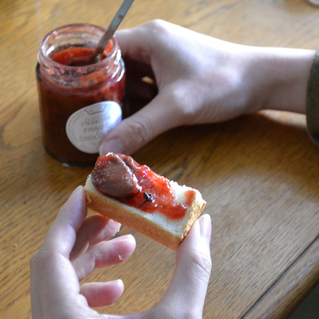 赤ワインといちごのショコラコンフィチュール。ベリーのような酸味のあるショコラと熊本いちご。その両方の美味しさをひと瓶に。