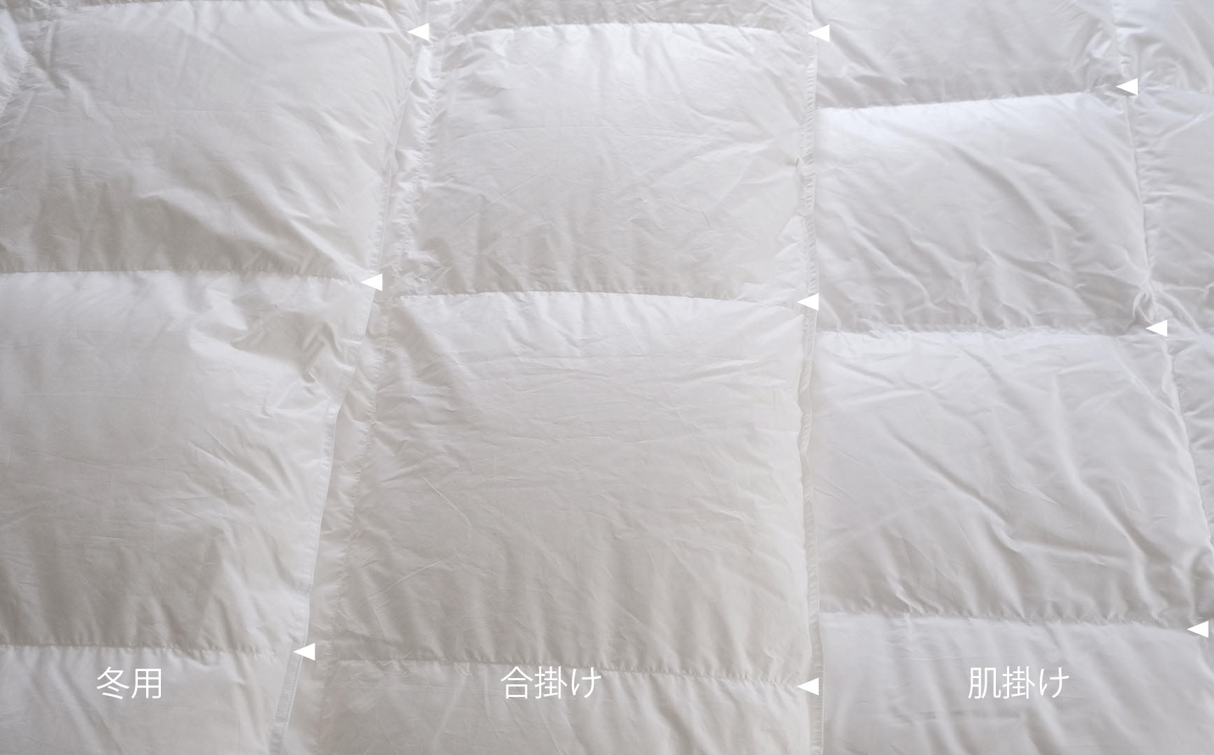 ▲冬用と合掛けは5×6=30マスの立体キルト、肌掛けは6×7=42マスのマチの無い直接キルト。一般的な4×5=20マスに比べ、フィット性が高く冷気が入り込むことを防ぎます。また夏用の肌掛けはマチ無しで熱が逃げやすい構造