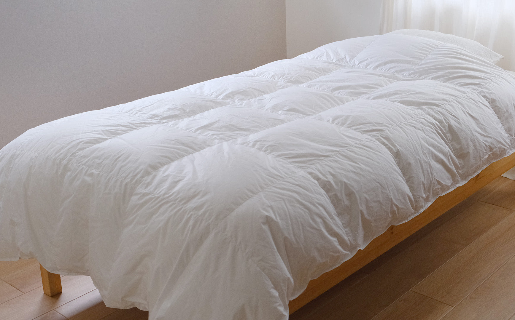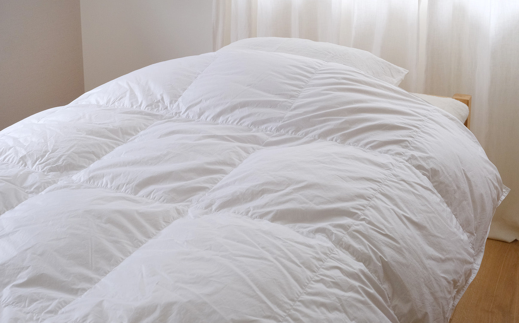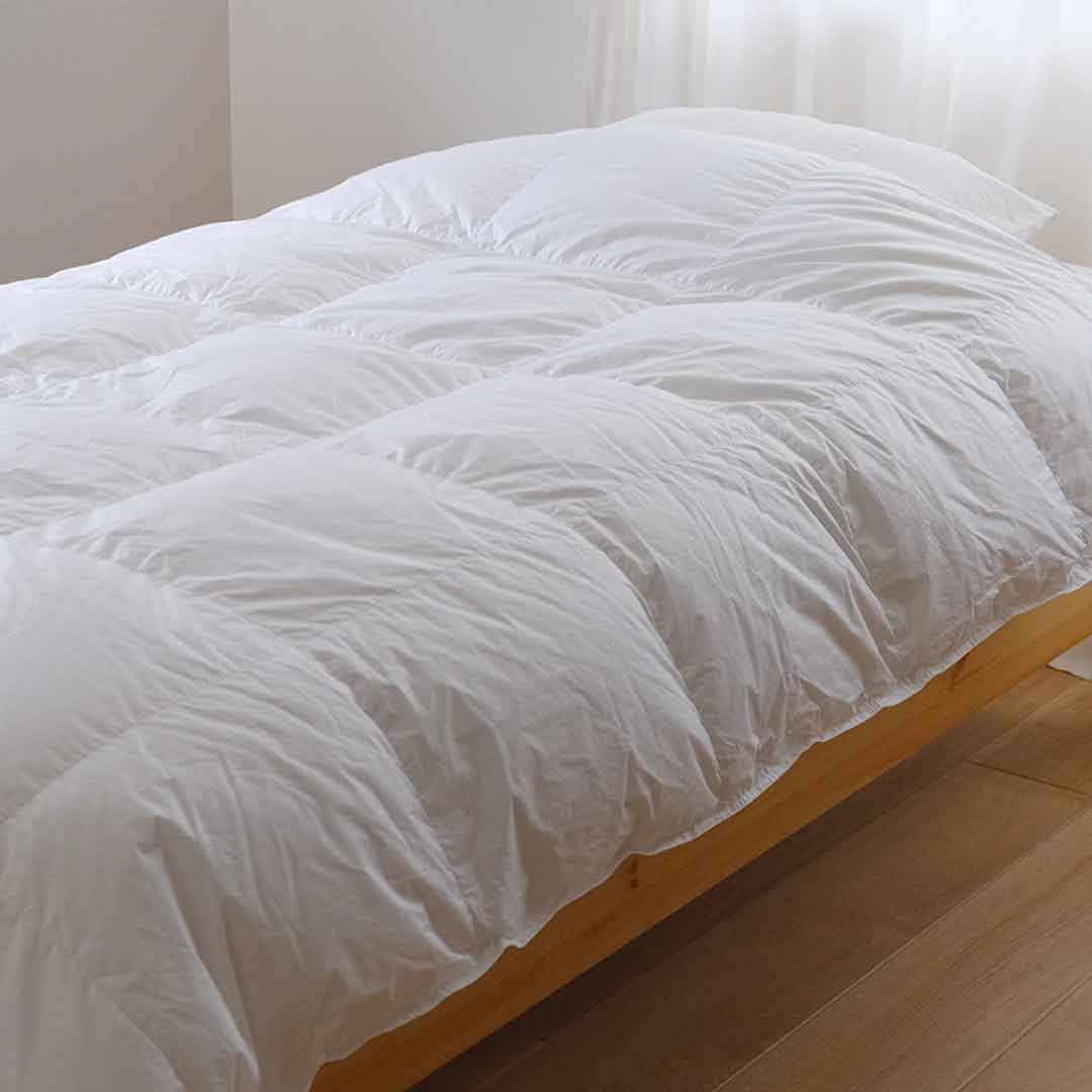 木造一軒家や古い家にお住まいの方や冷えが気になる方、寒さの厳しい地方のかたはこちらの冬用(800g)があると安心です。寒さに応じて、ケットを足して調節してください。そして、夏でも羽毛布団を使いたい方や通年20℃くらいで過ごせる沖縄などにお住いの方は肌掛け(300g)を。エアコンでの室温コントロールをしながら、使っていただくと蒸れ知らずで快適です。