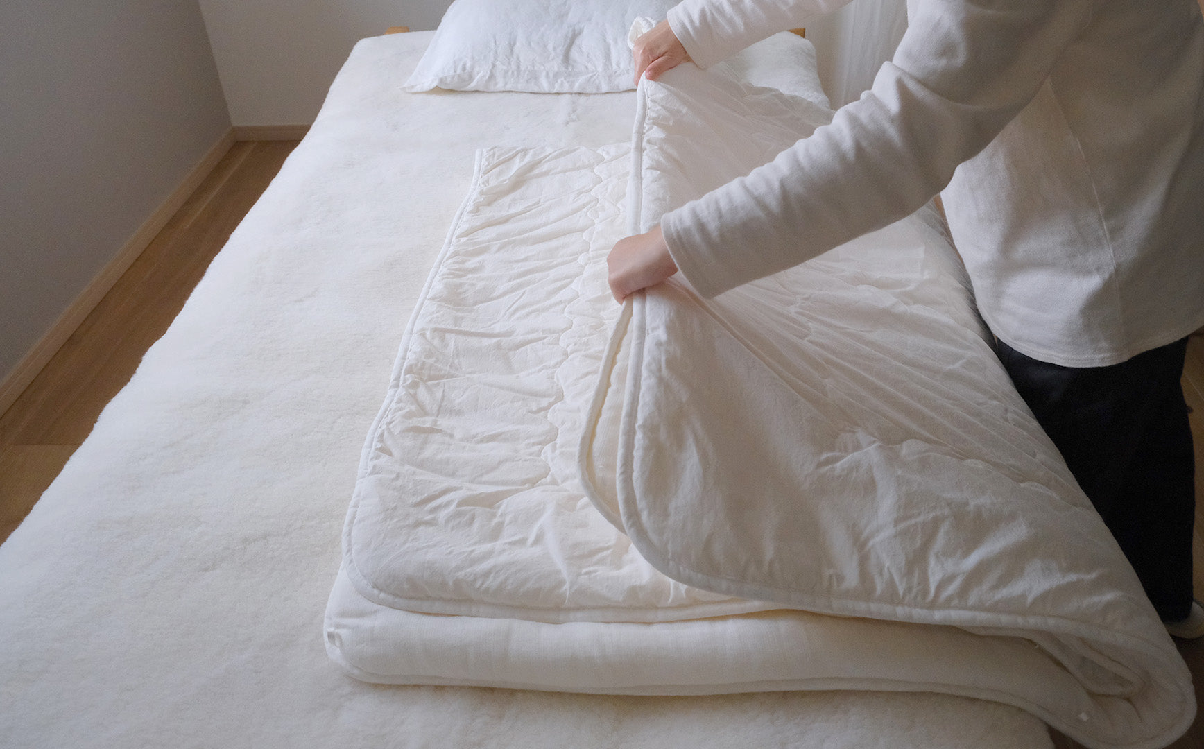 スタッフみんなが虜になったのが、羊毛合い掛け布団の肌触りと掛け心地。ISHITAYAで30年来愛され続けるガーゼ生地と平織生地のあいだに上質なクリンプを持つ長い羊毛がたっぷり詰まっています。冬はサブで他の季節はメインに2~3シーズン活躍してくれる羊毛布団は、通年使える万能選手です。