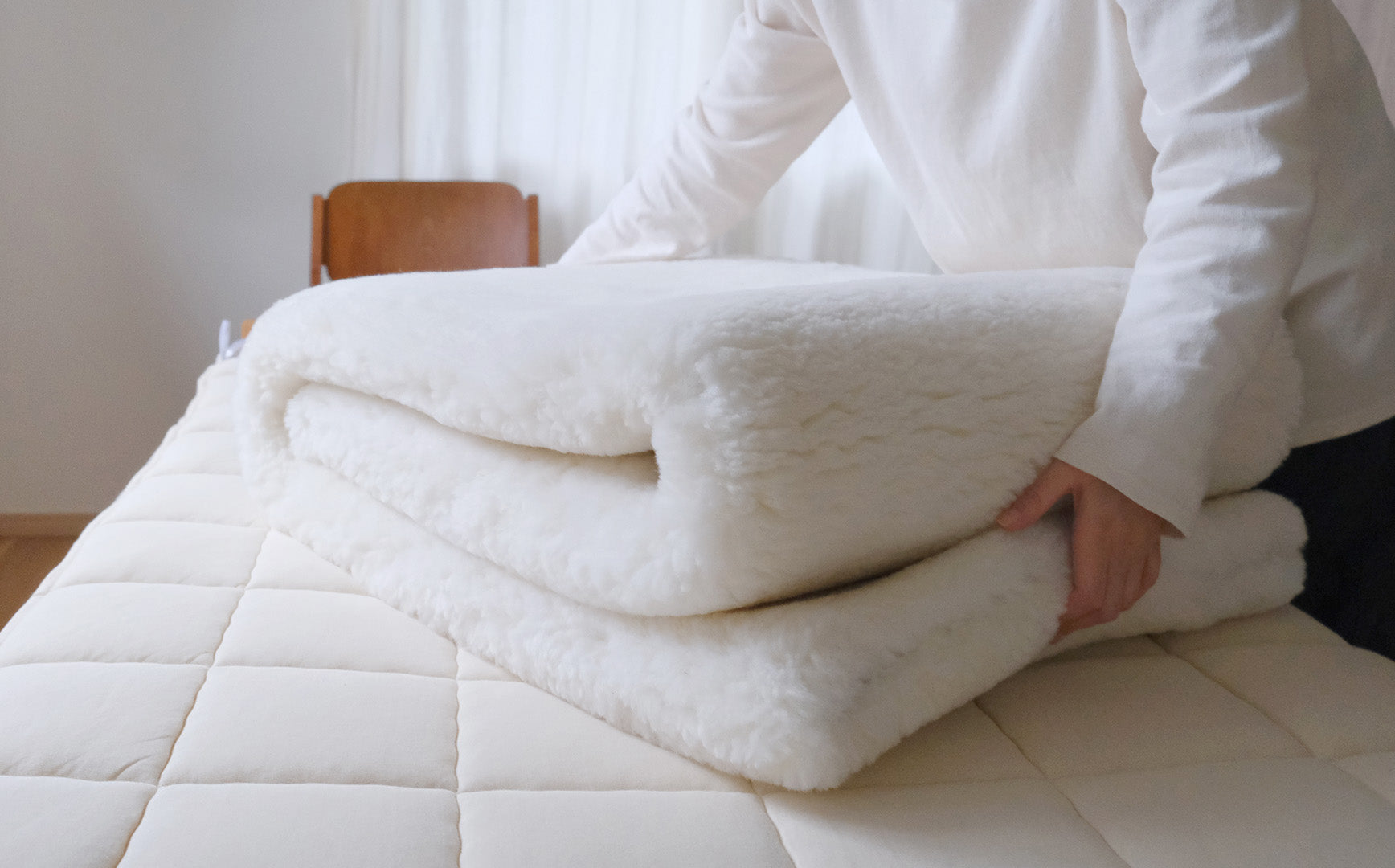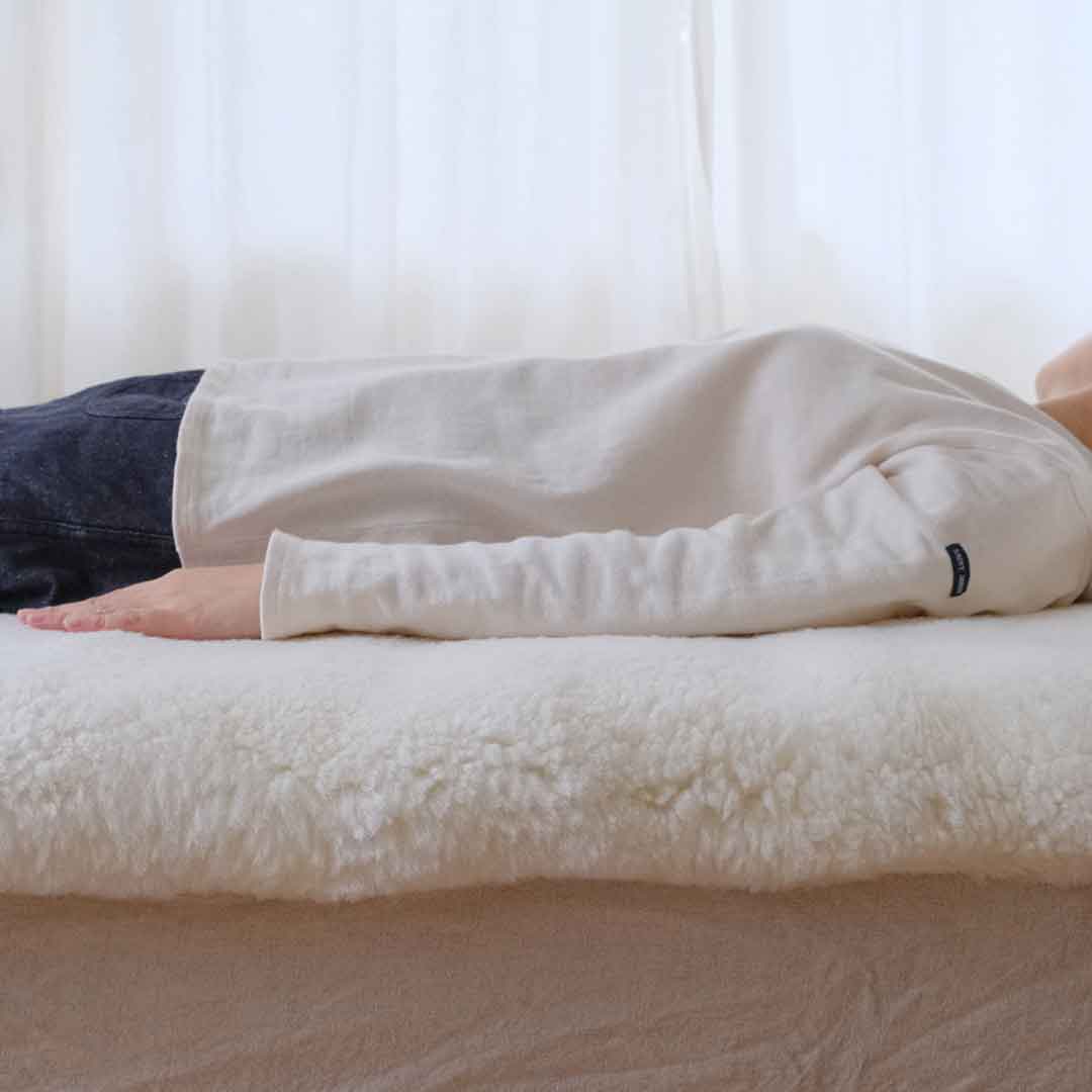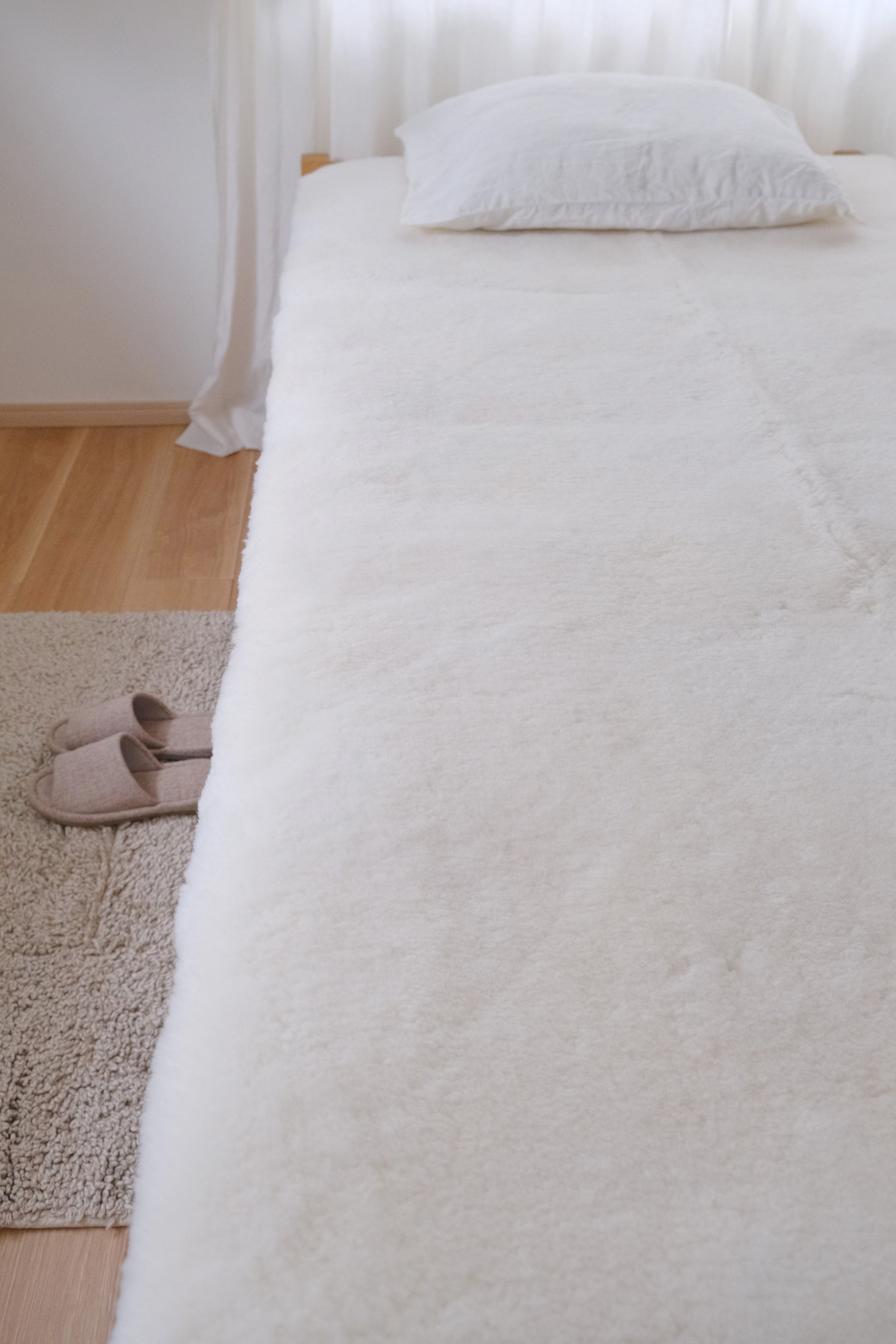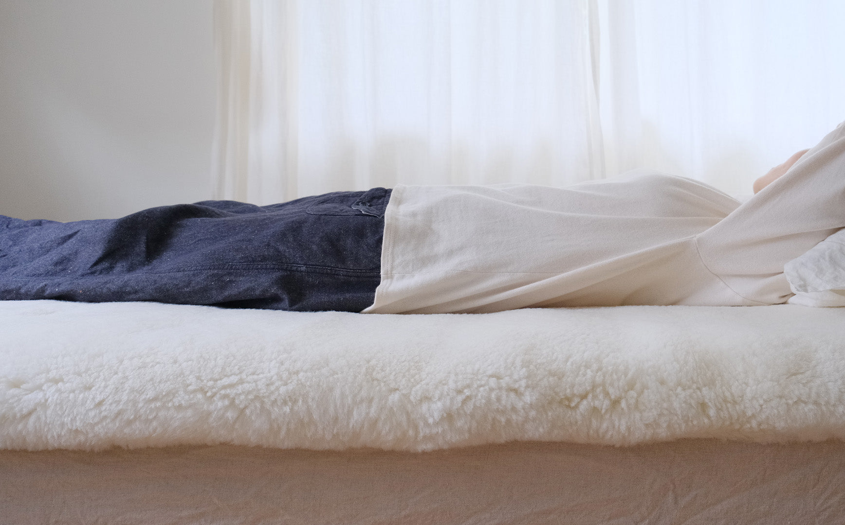 羊の毛が密集したムートンは熱伝導率がとても低く、冬にあたたかく、夏に涼しいを叶えてくれる天然繊維です。高密度な羊の毛が天然のスプリングのように身体を支えるベッドパッドは、冷えでお悩みの方やベッドで長時間過ごされる方におすすめしたいアイテムです。