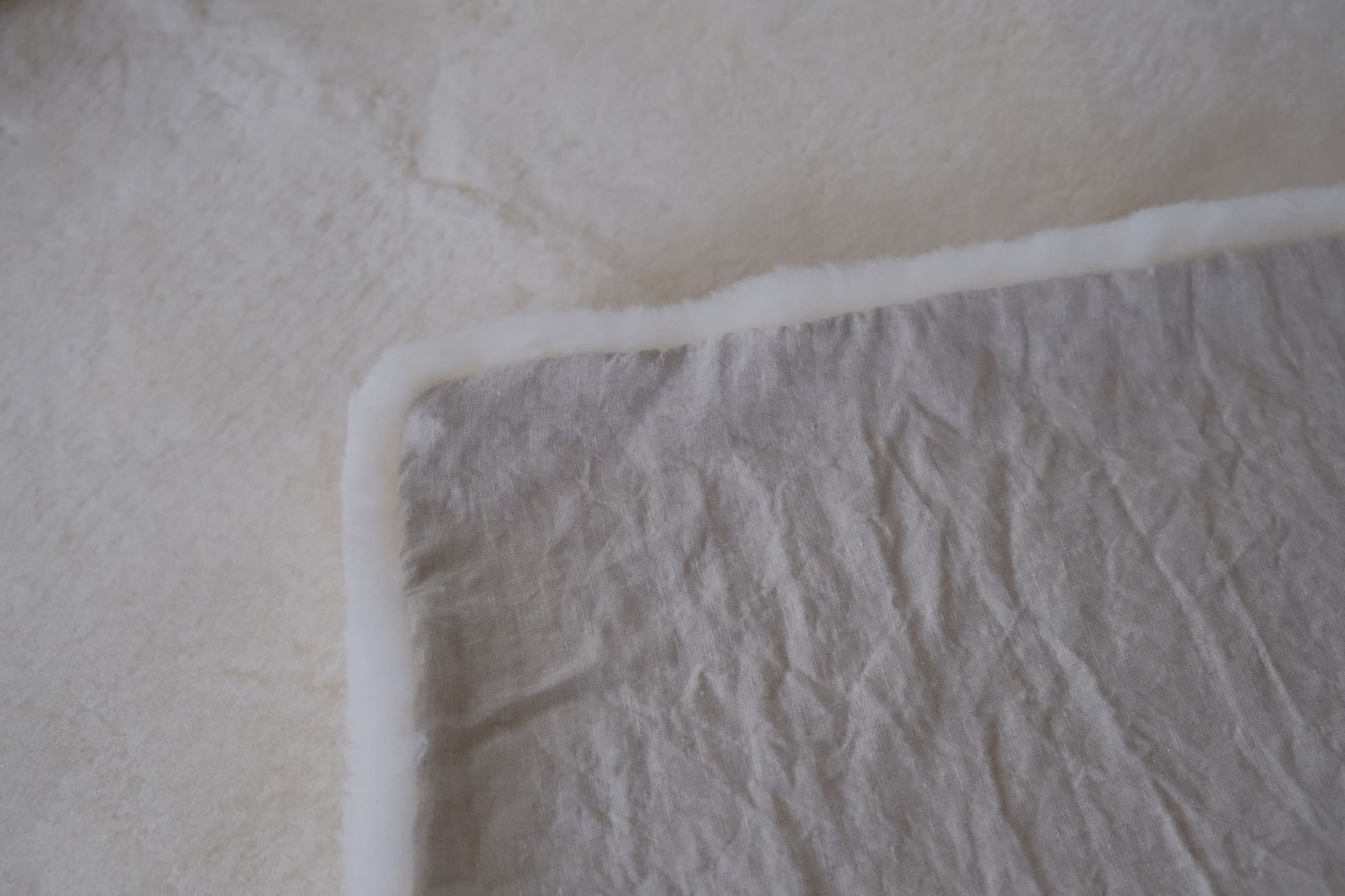 ▲裏生地には滑らかなイタリアンリネン。ウレタンなど芯材を使用せずムートンの毛の弾力だけで身体を支えます。調湿効果が高く、薄く薄いためすっきりとした寝心地