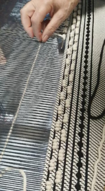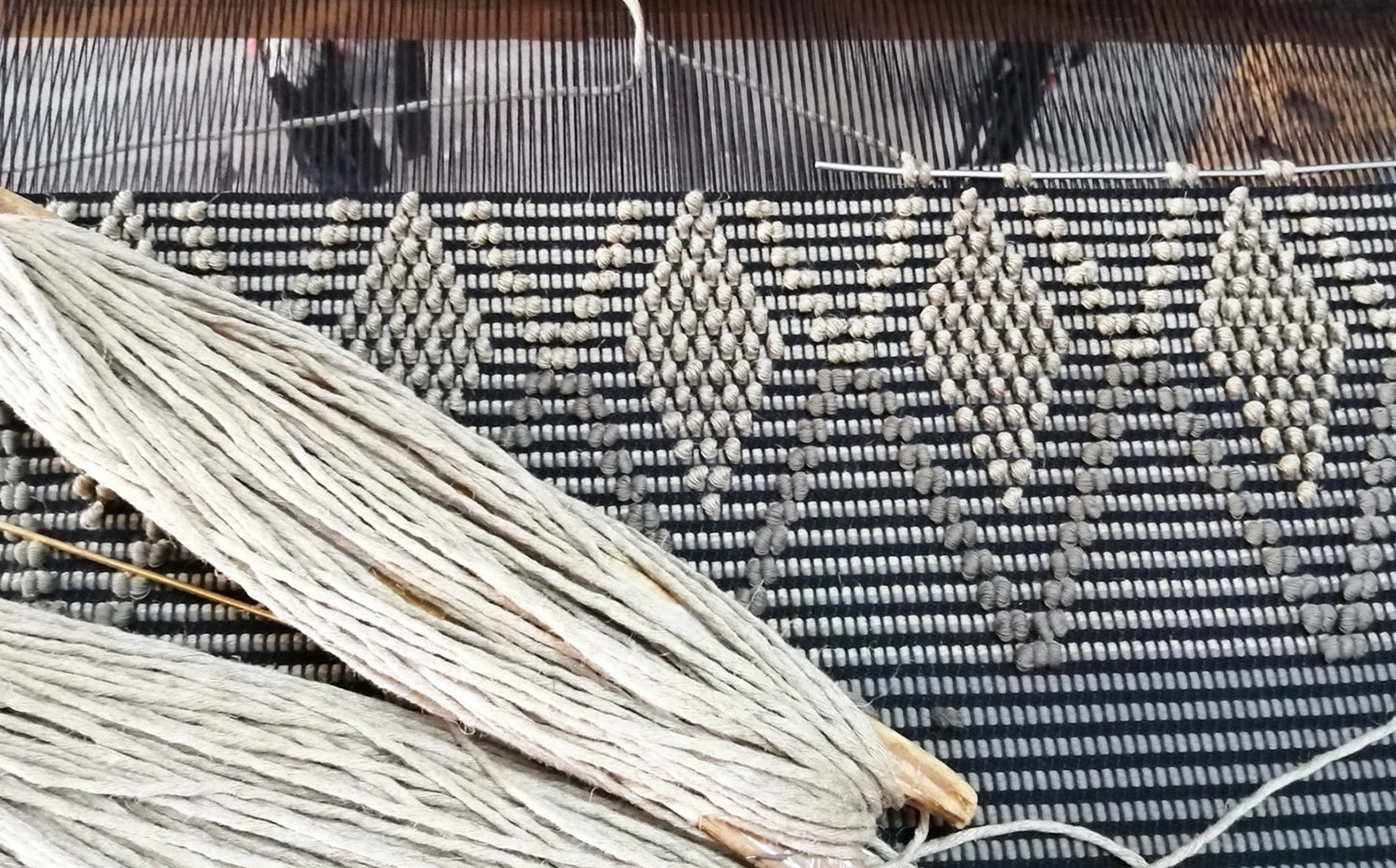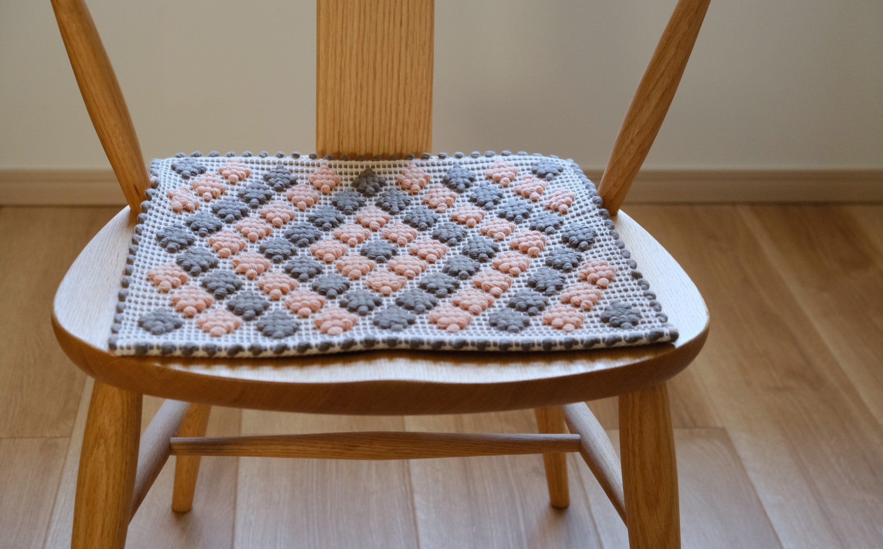 サルデーニャの伝統的な織技法のひとつ「ピビオーネ」で匠に表現された幾何学文様が特徴のチェアシート。▲ぽんぽんと点描画のような織で表現された小さなひし形文様。仕上がりには一枚につき2~3時間かかります