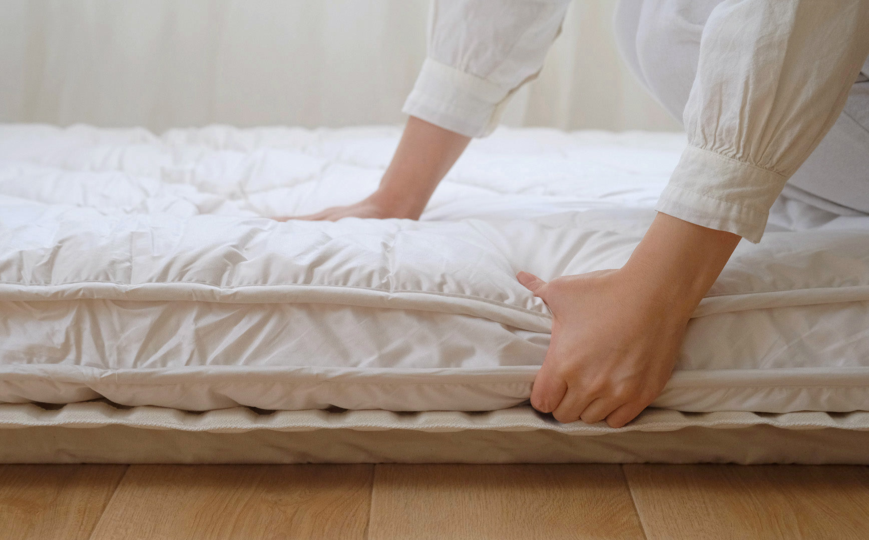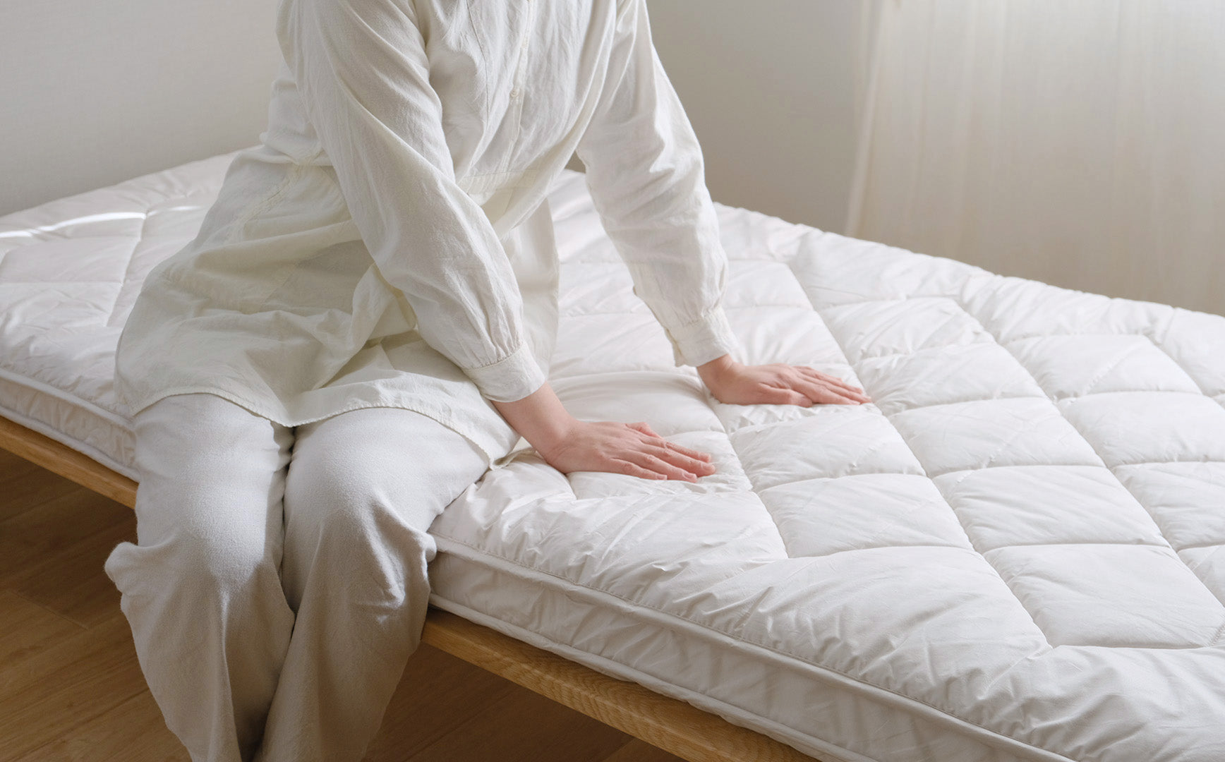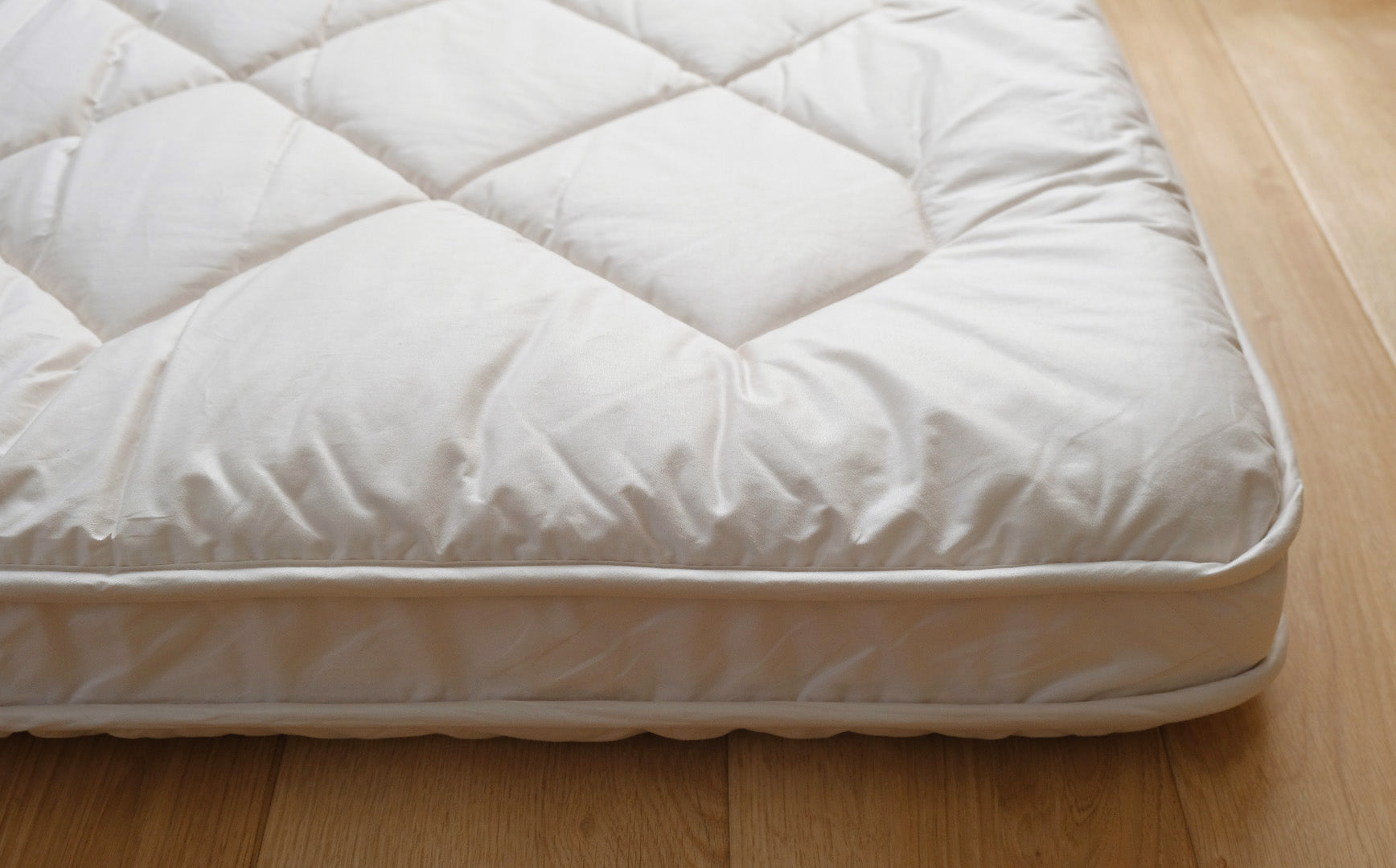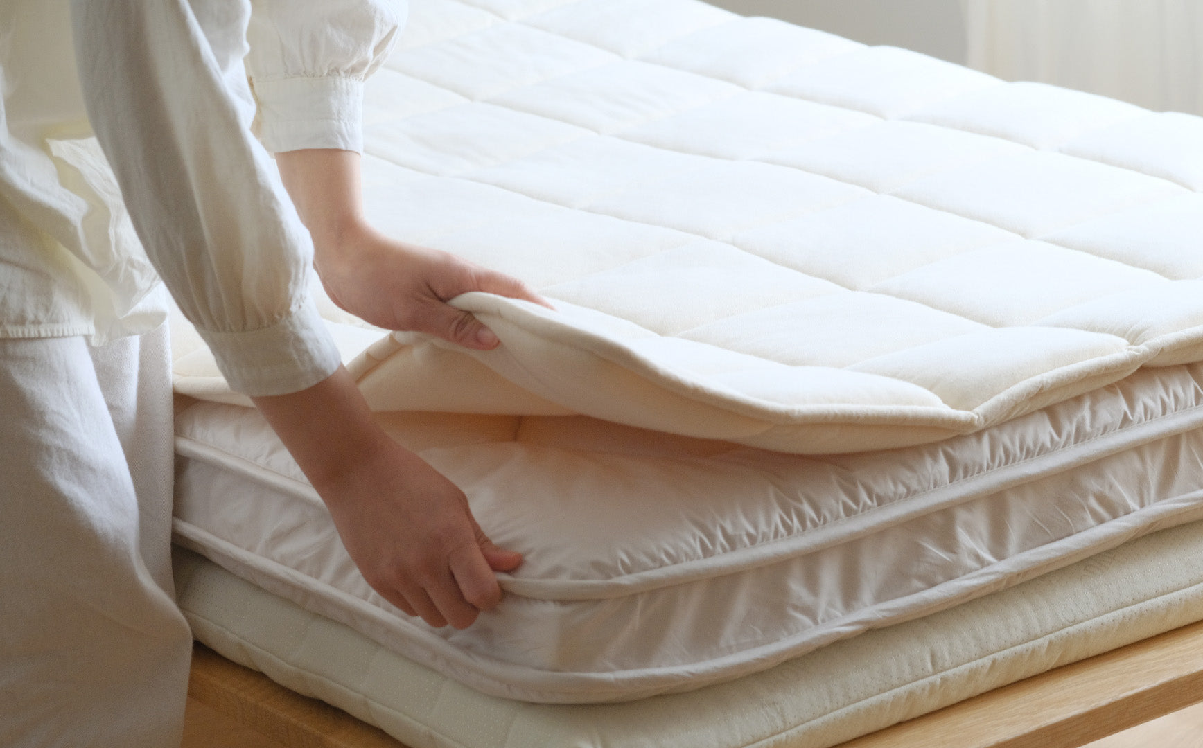 ▲柔らかすぎず、硬すぎない弾力です▲リネンやウールベッドパッドを上に重ねることでより快適に。敷き布団の清潔さと耐久性を保つ効果も
