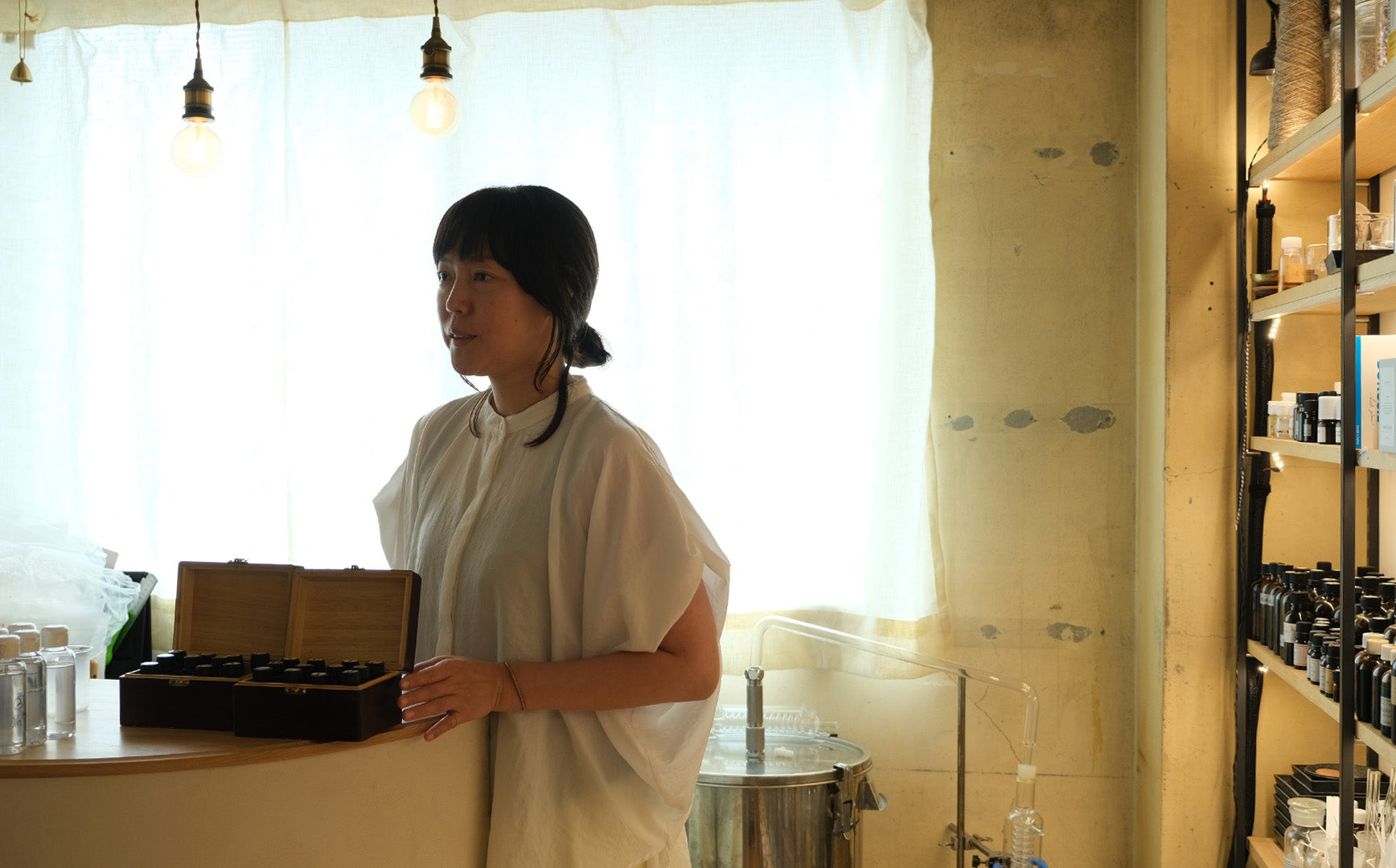 「もともとは自分のためにつくったプロダクトなんです」と話すのは、つくり手の山野辺さん。fragrance yes の商品は山野辺さんがアトピー性皮膚炎に悩まされた経験から植物療法を勉強し、そのライフワークから生まれたセルフケアプロダクトです。