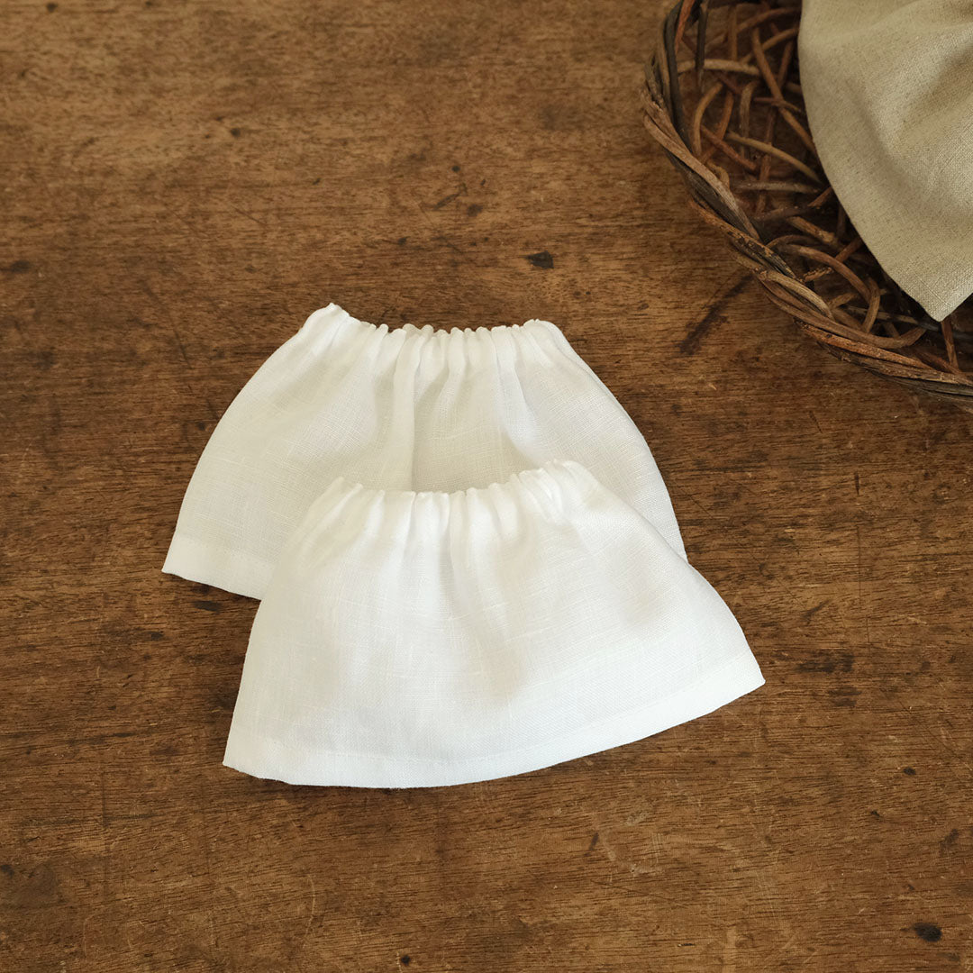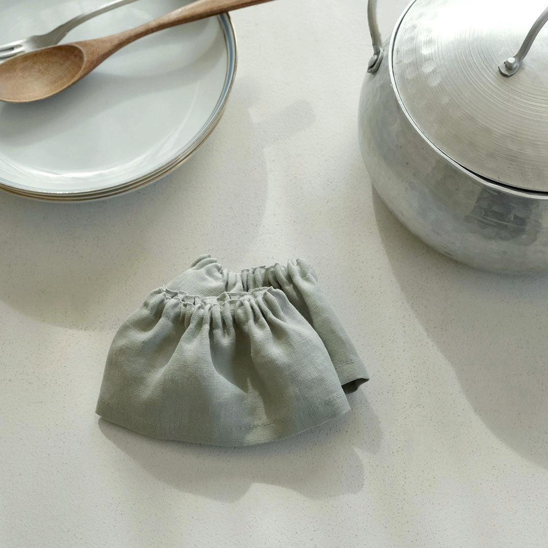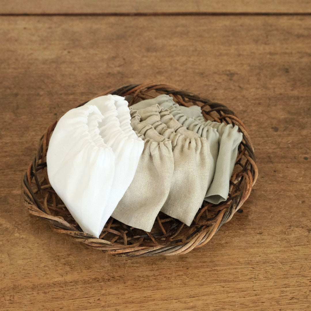 台所仕事や掃除の時間を快適なものにしてくれるリネンのアームカバー。ベッドシーツを仕立てる時にできるリネンの端切れを活用してつくりました。ワイシャツのカフスがそのままカバーになったような、すっきりとしたミニマルさが魅力です。