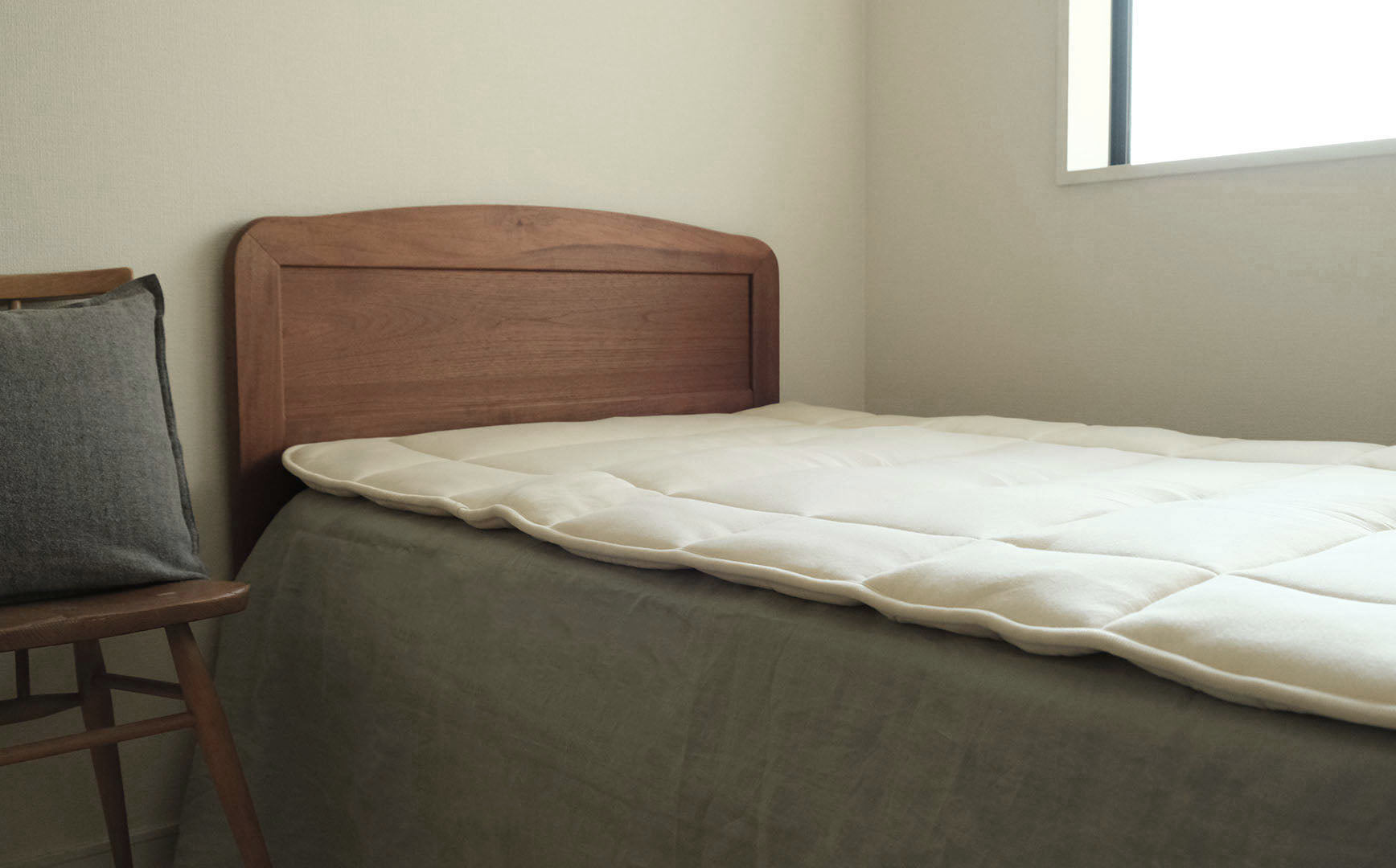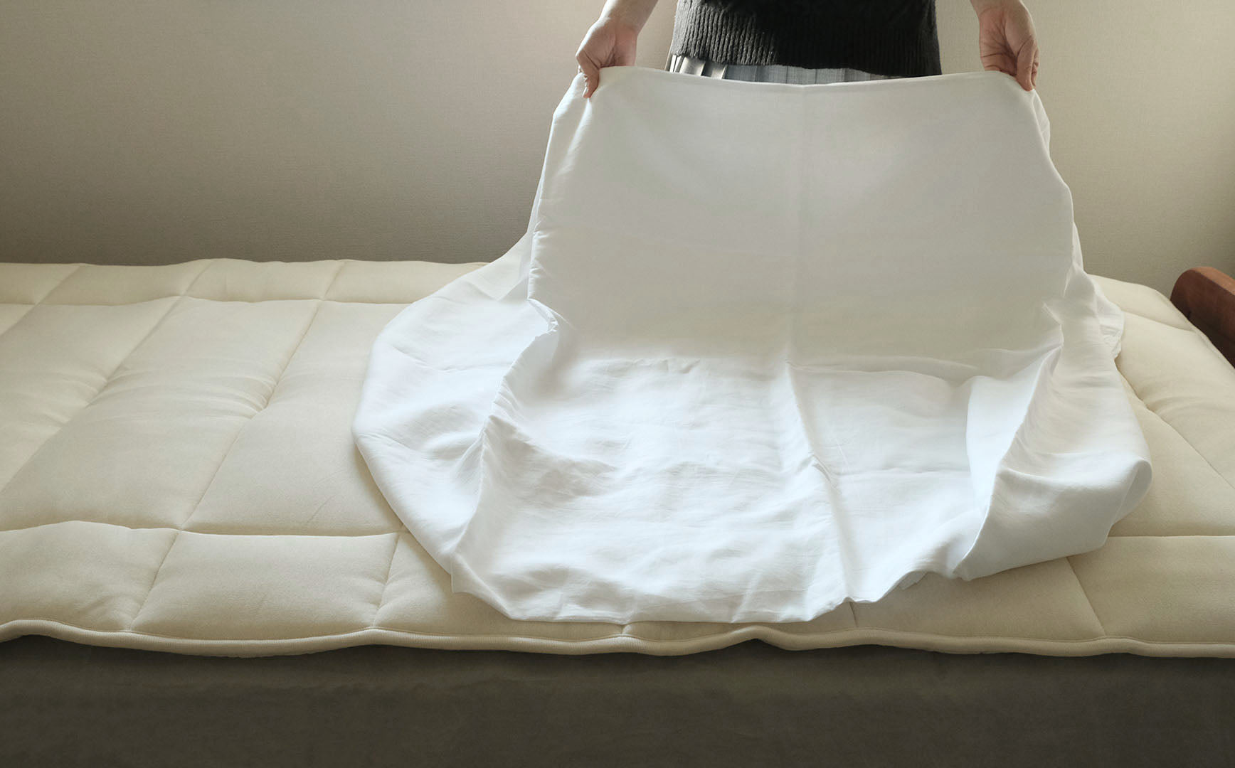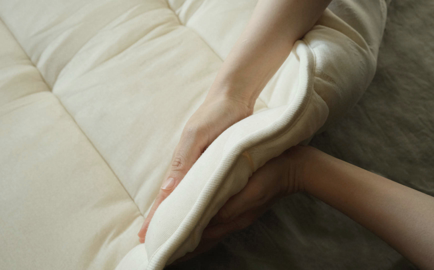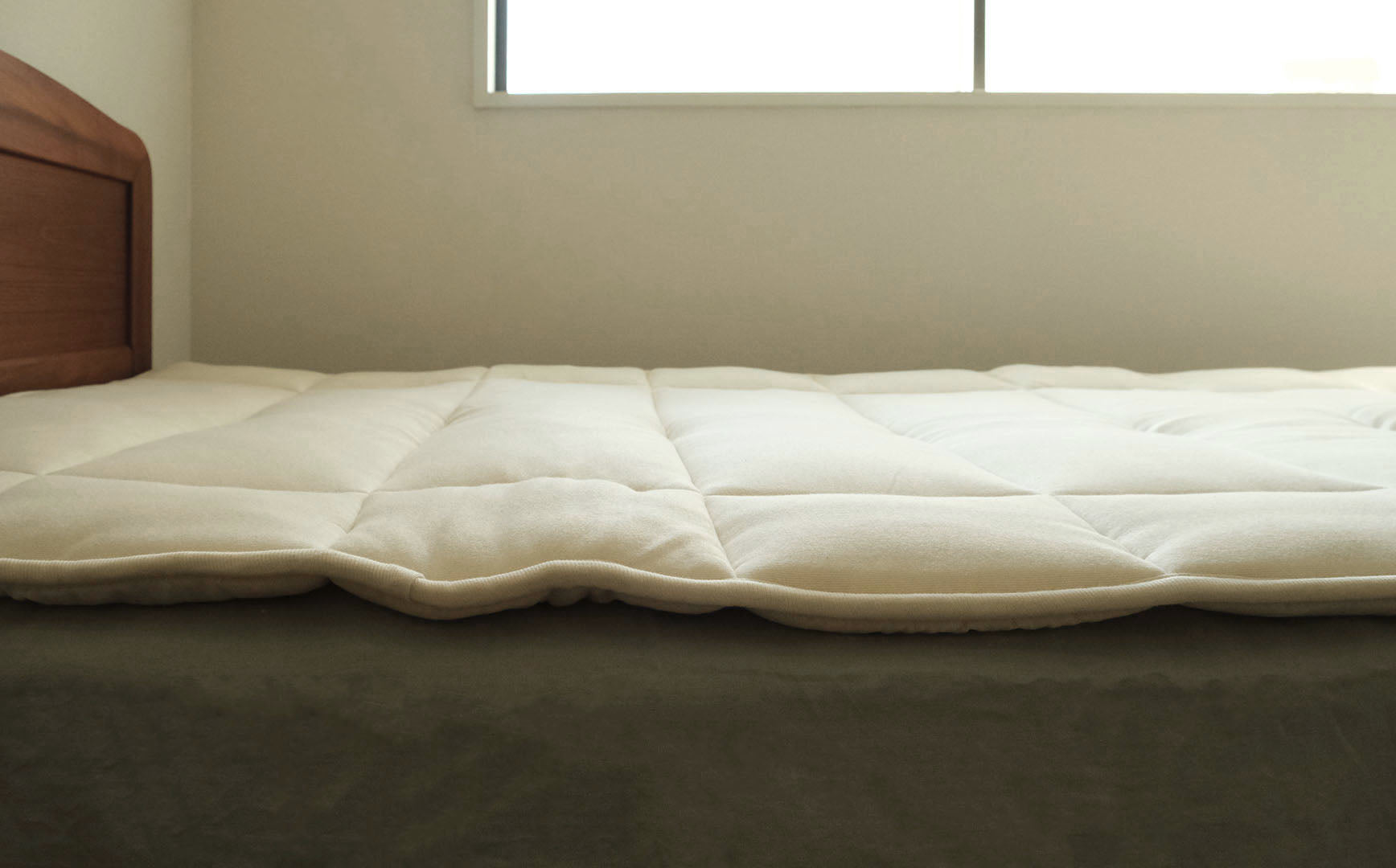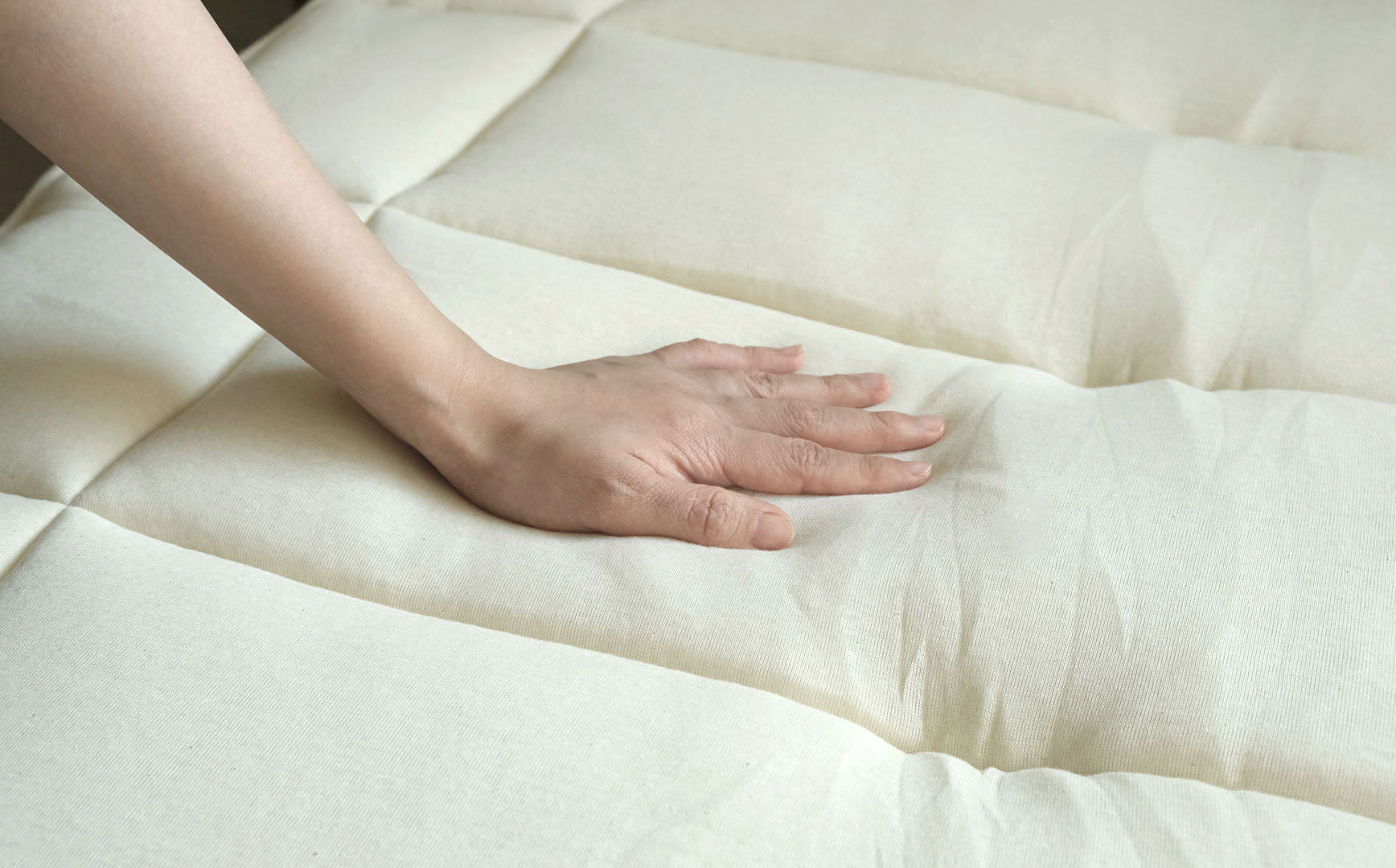 自然のスプリングを感じる弾力性は、まさにウールの敷き布団のなせる技。身体の重さを均等に分散してくれるので、ウールのベッドパッドのように使っていただけます。