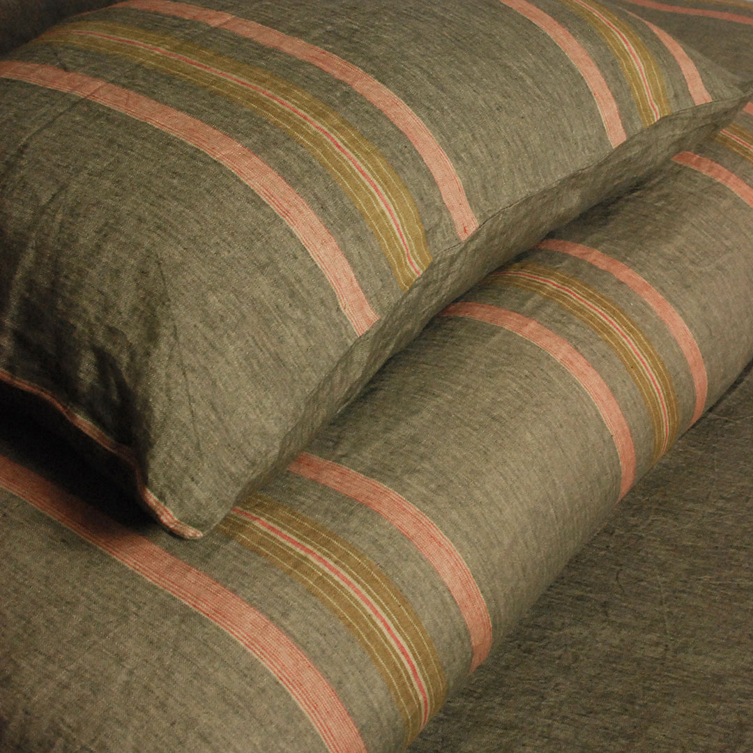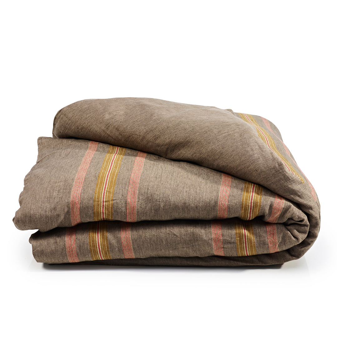 グレイッシュなブラウンに赤いピンストライプがアクセントになった、デュベカバー・ノッティングヒル。デュベカバーの入れ口はビンの口のような形状をしたボトルネックで、マットレスに巻き込んだり、カバーの内側に折り込んで使用します。同シリーズにピローケースがあります。