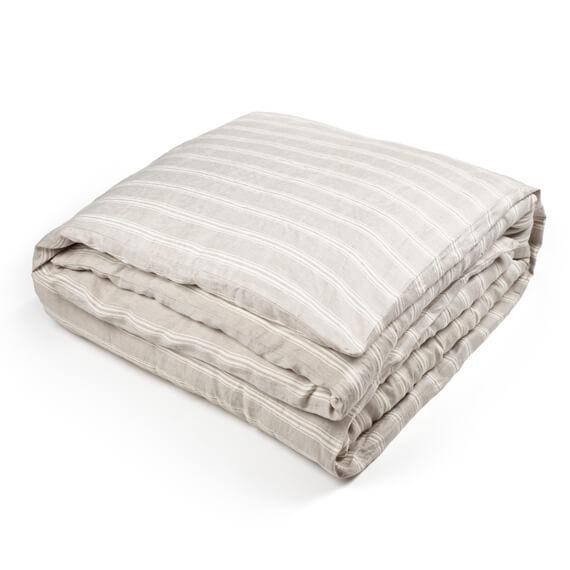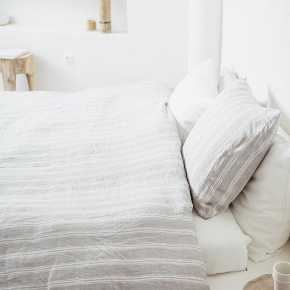 ナチュラルで洗練されたイメージのデュベカバー・ゲストハウスストライプ。淡いグレーでリラックス感のあるワイドなランダムストライプが特徴です。ほどよい厚さの綾織に、洗い加工をかけた柔らかな風合いの生地。デュベカバーの入れ口はビンの口のような形状をしたボトルネックで、マットレスに巻き込んだり、カバーの内側に折り込んで使用します。