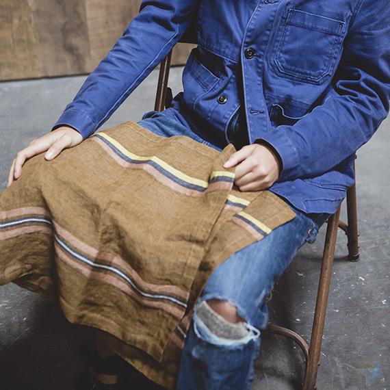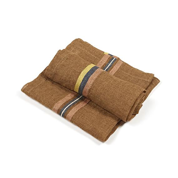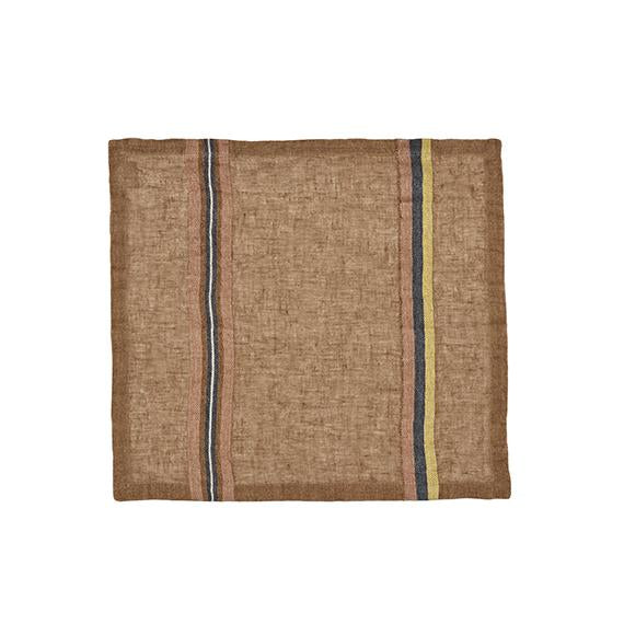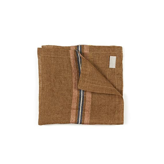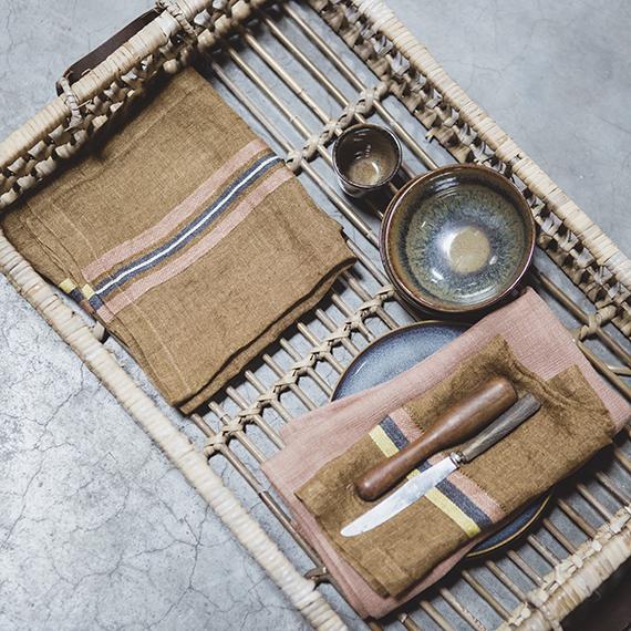 透け感のある薄地リネンのナプキン・ヴァージニア。ブラウンをベースに、ネイビーやピンクのラインがシックにまとまった一枚です。ガーゼのように使いはじめから柔らかい肌触り。オリンピアシリーズとあわせて、モダンなテーブルコーディネートをお楽しみください。