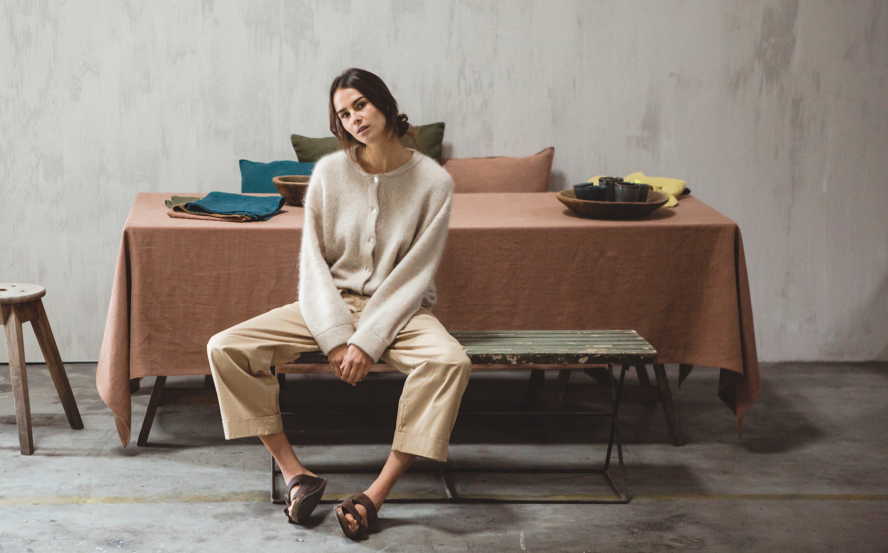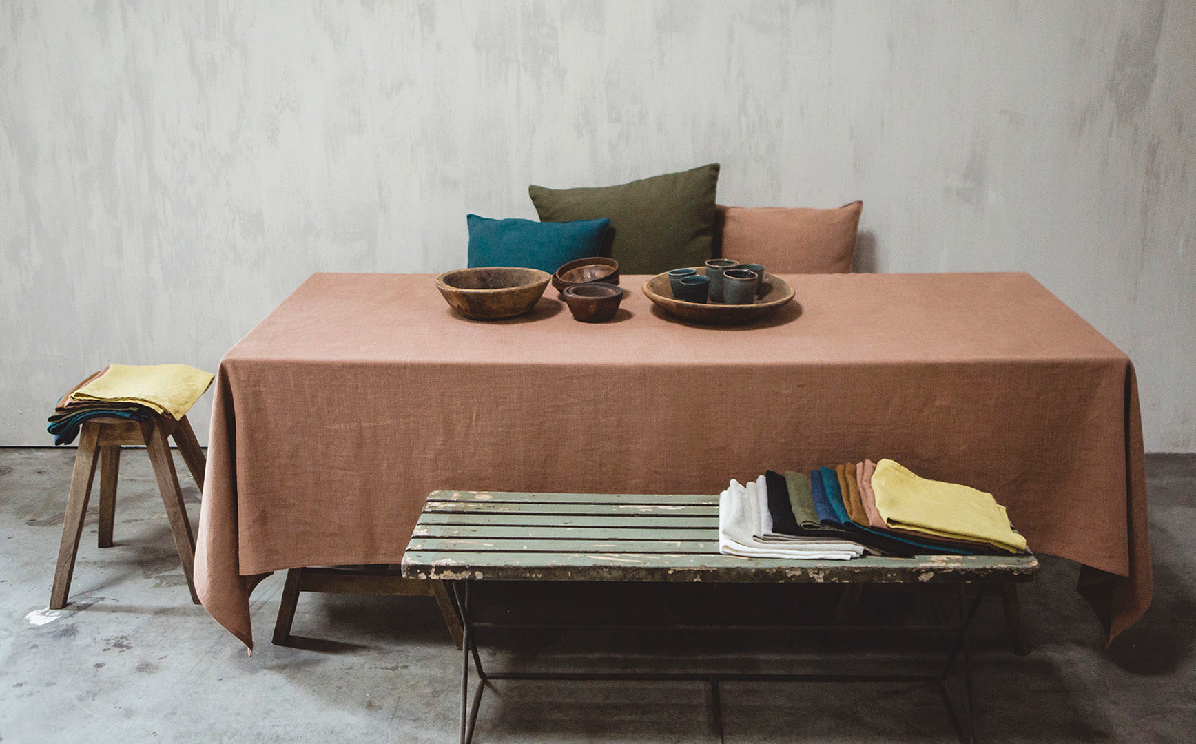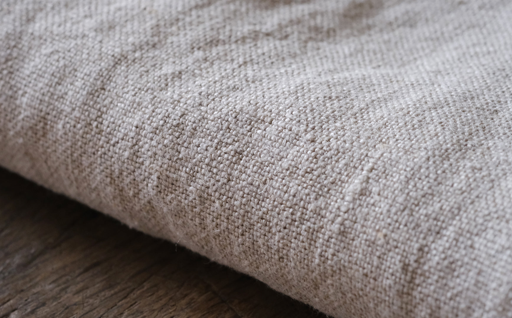しっかりとした重厚なリネン生地でありながら、使いはじめから柔らかくてラフな風合いが魅力。その柔らかさはウォッシュ加工によるもので、触り心地のよさに加えて趣のある表情になっています。