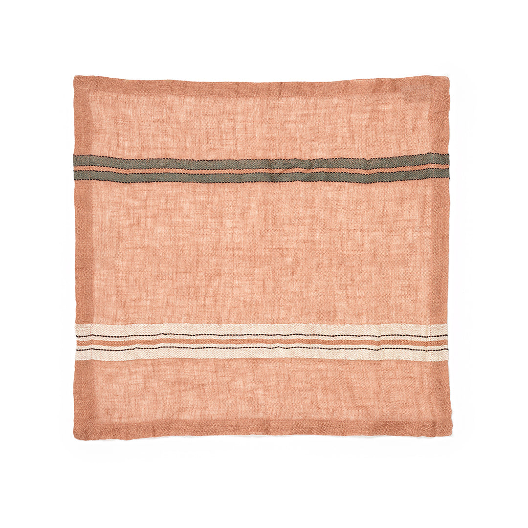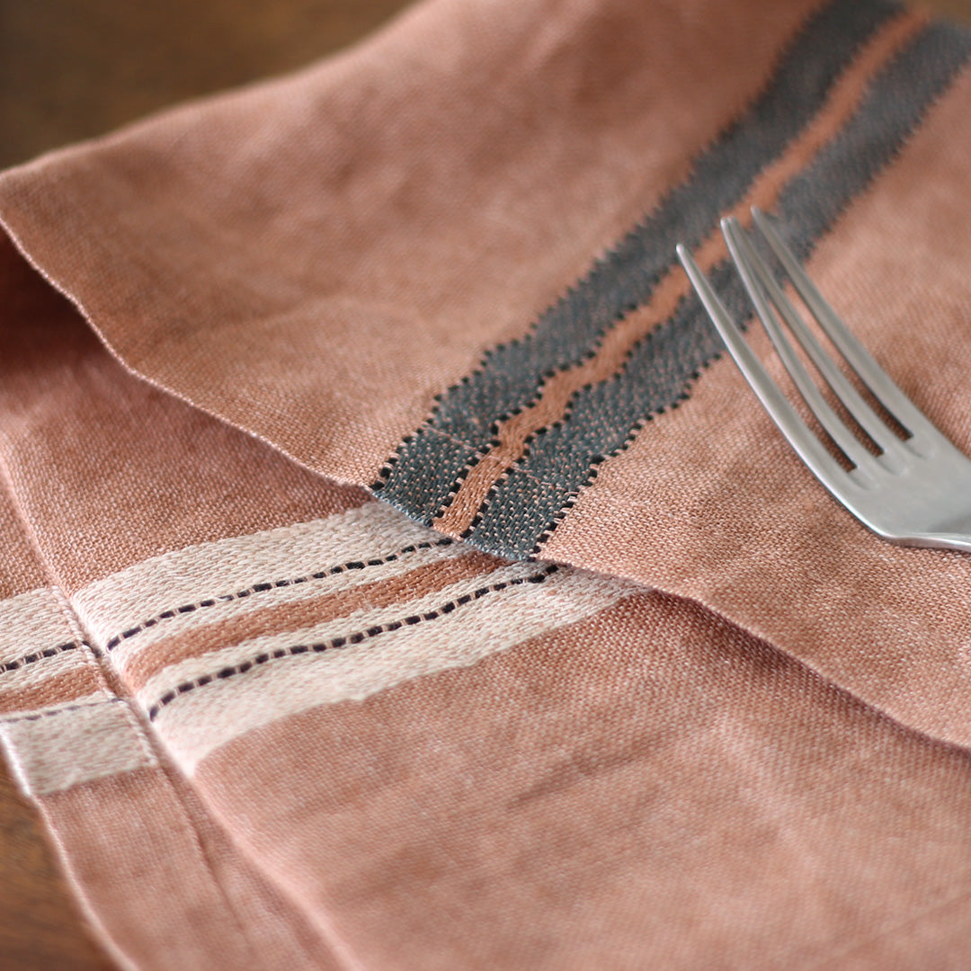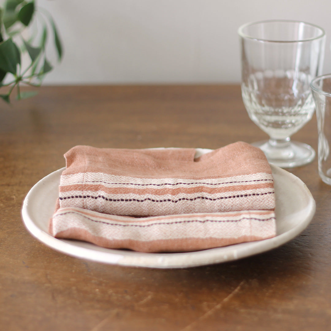 スモーキーなサーモンピンクを基調とした華やかなナプキン「モハベ」。グリーンのラインがアクセントになった、ティータイムにぴったりな愛らしい一枚です。