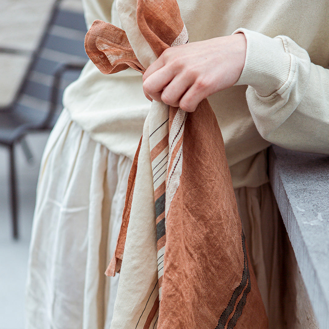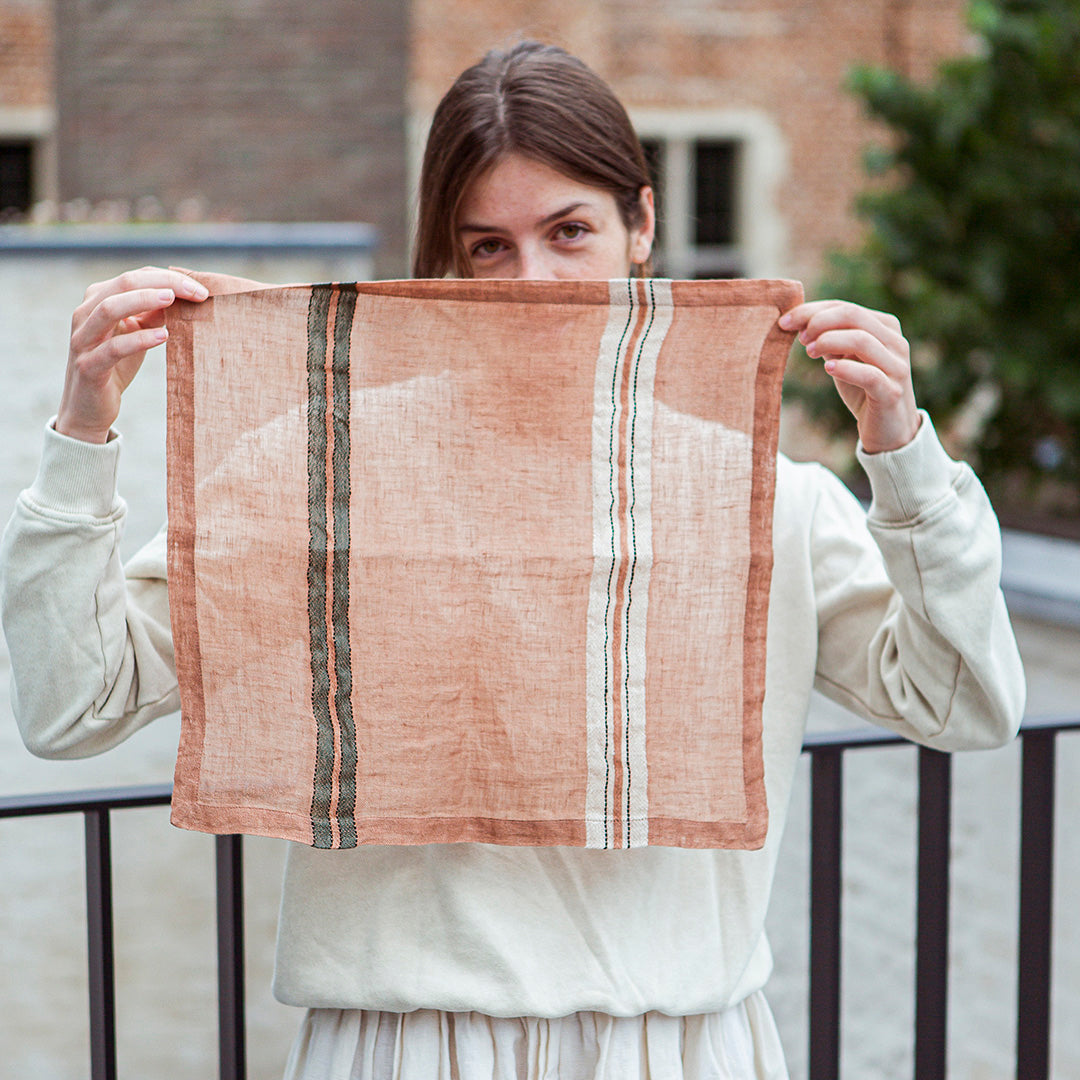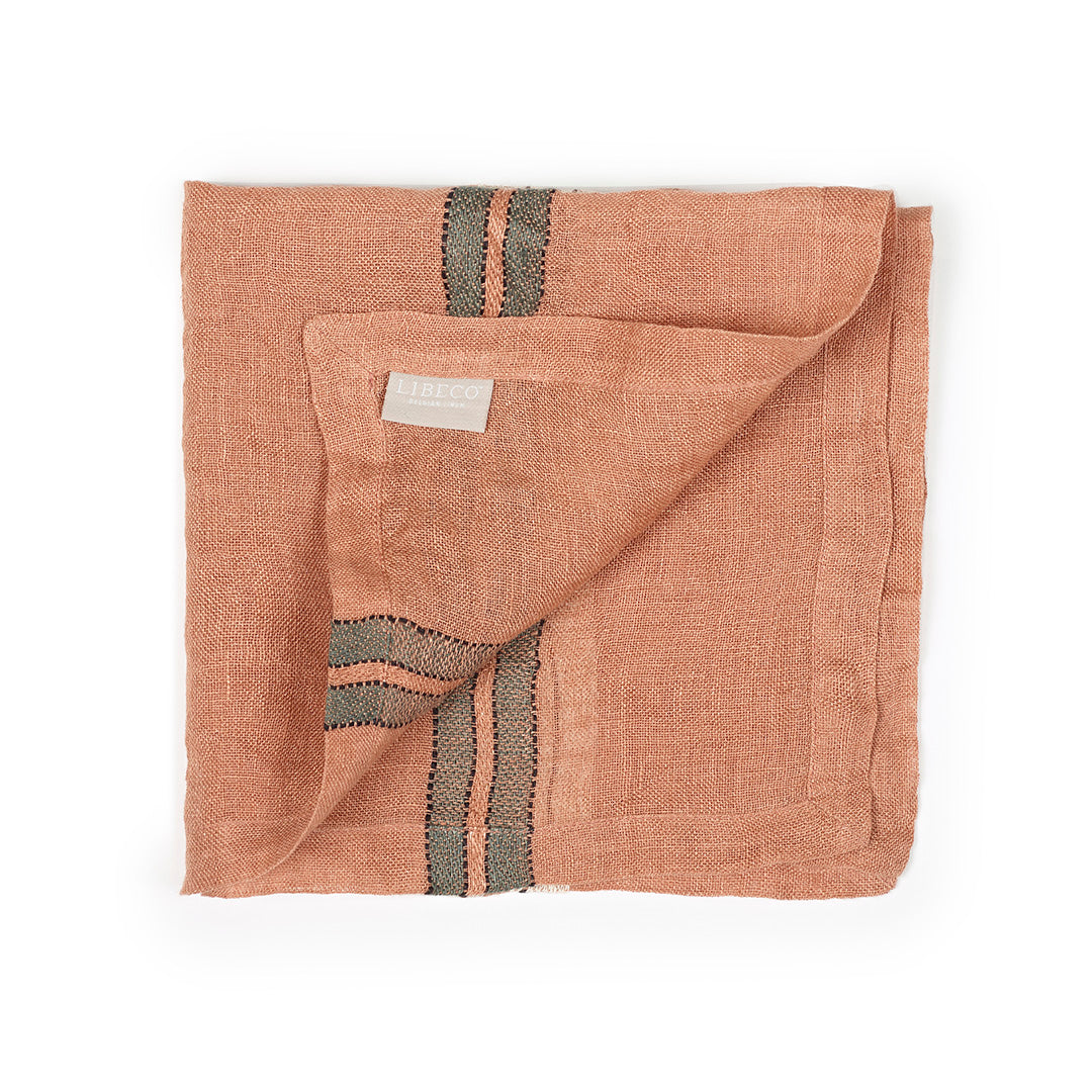 スモーキーなサーモンピンクを基調とした華やかなナプキン「モハベ」。グリーンのラインがアクセントになった、ティータイムにぴったりな愛らしい一枚です。