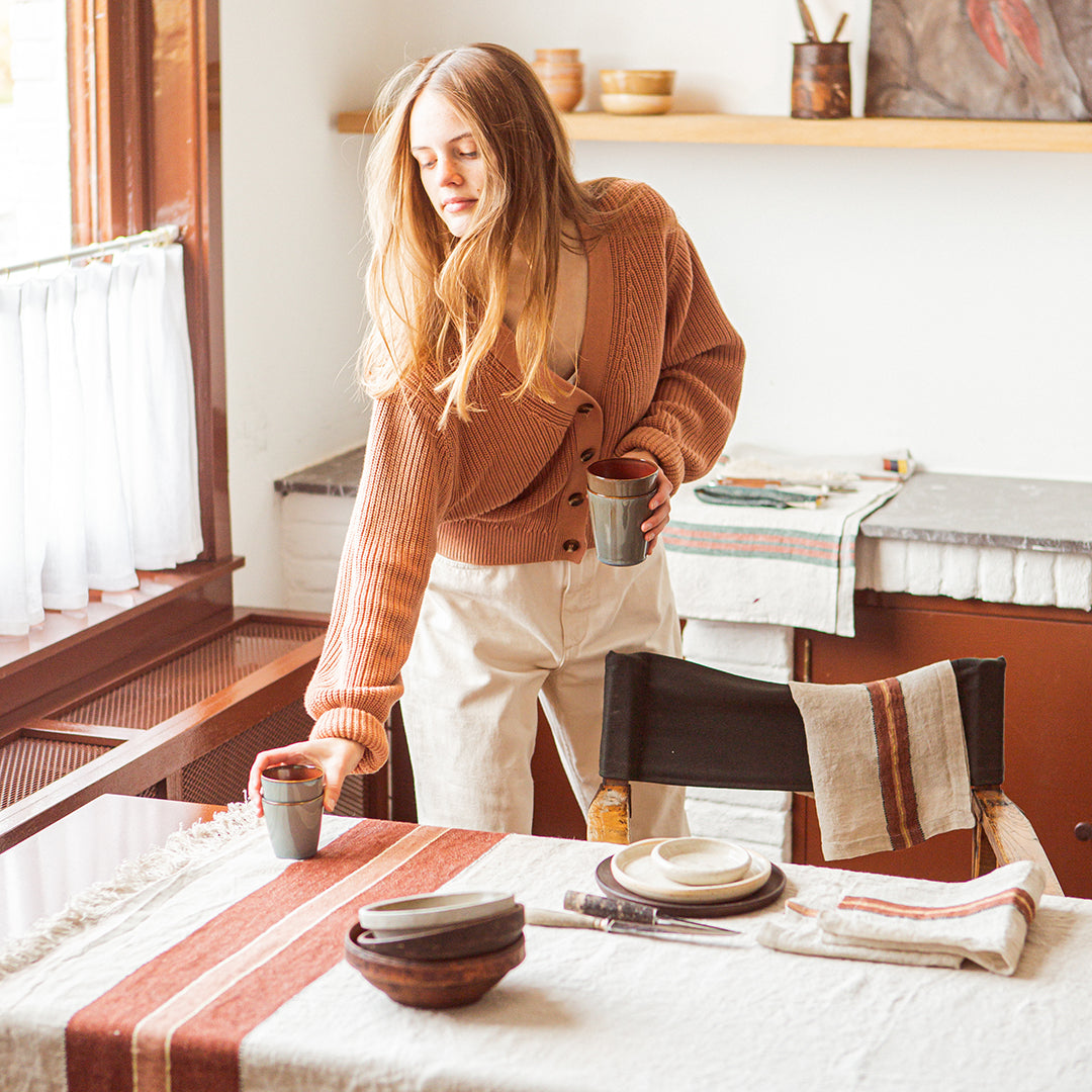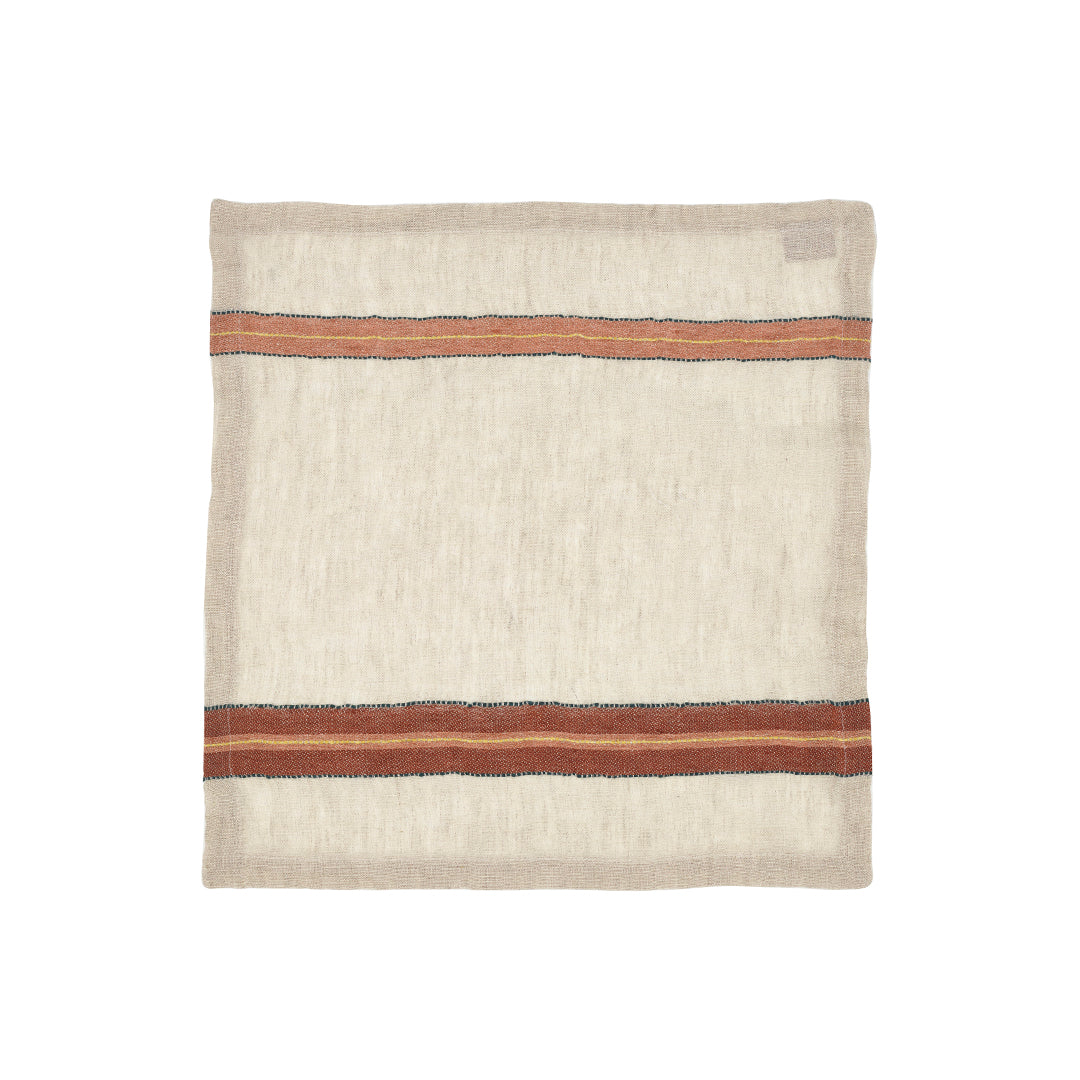 レザーブラウンにオレンジ、ノスタルジックなカラーリングが魅力のLIBECOのナプキン・バンクス。洗いのかかったガーゼ生地は、使いはじめからふわふわな風合いです。