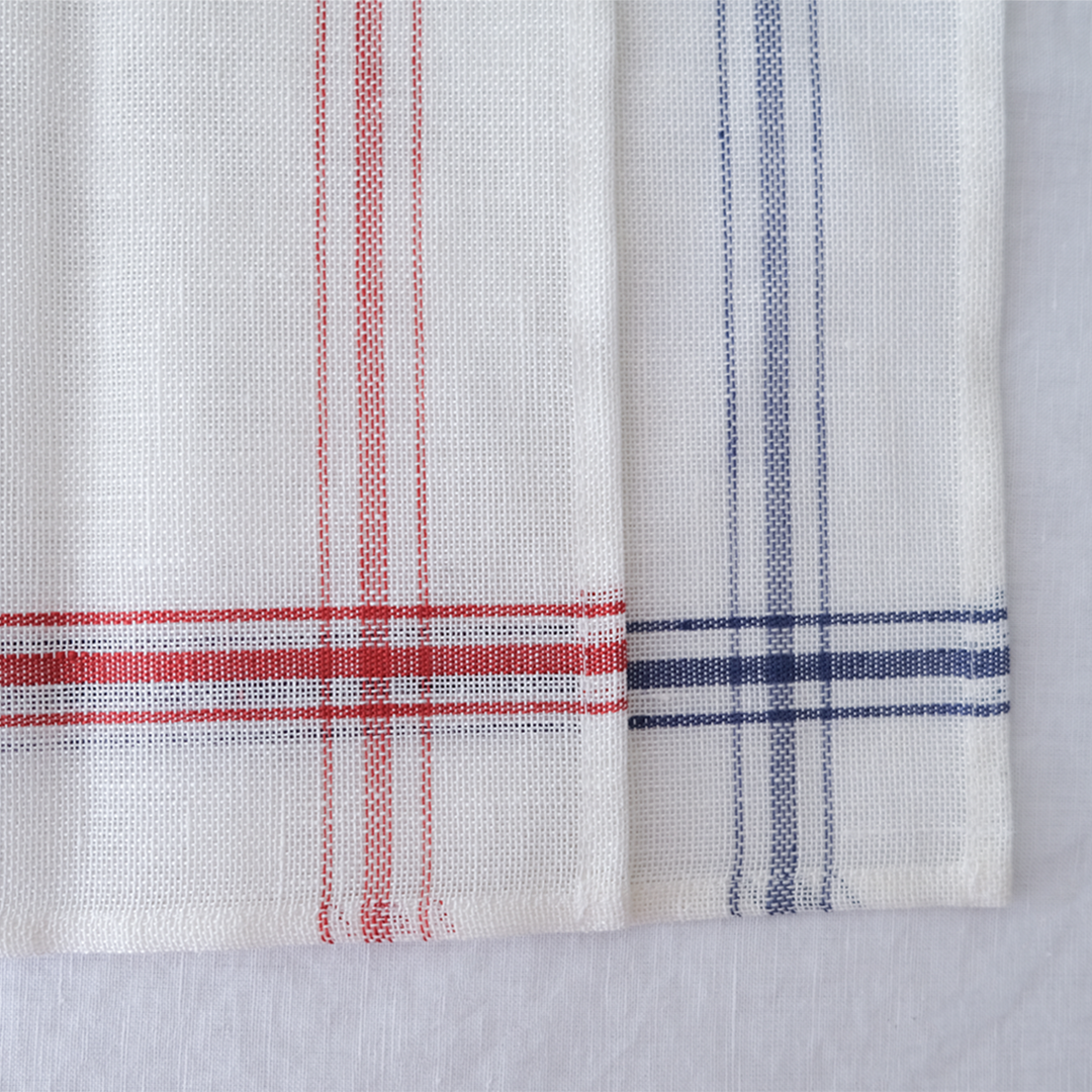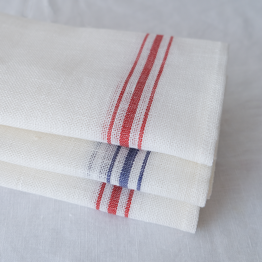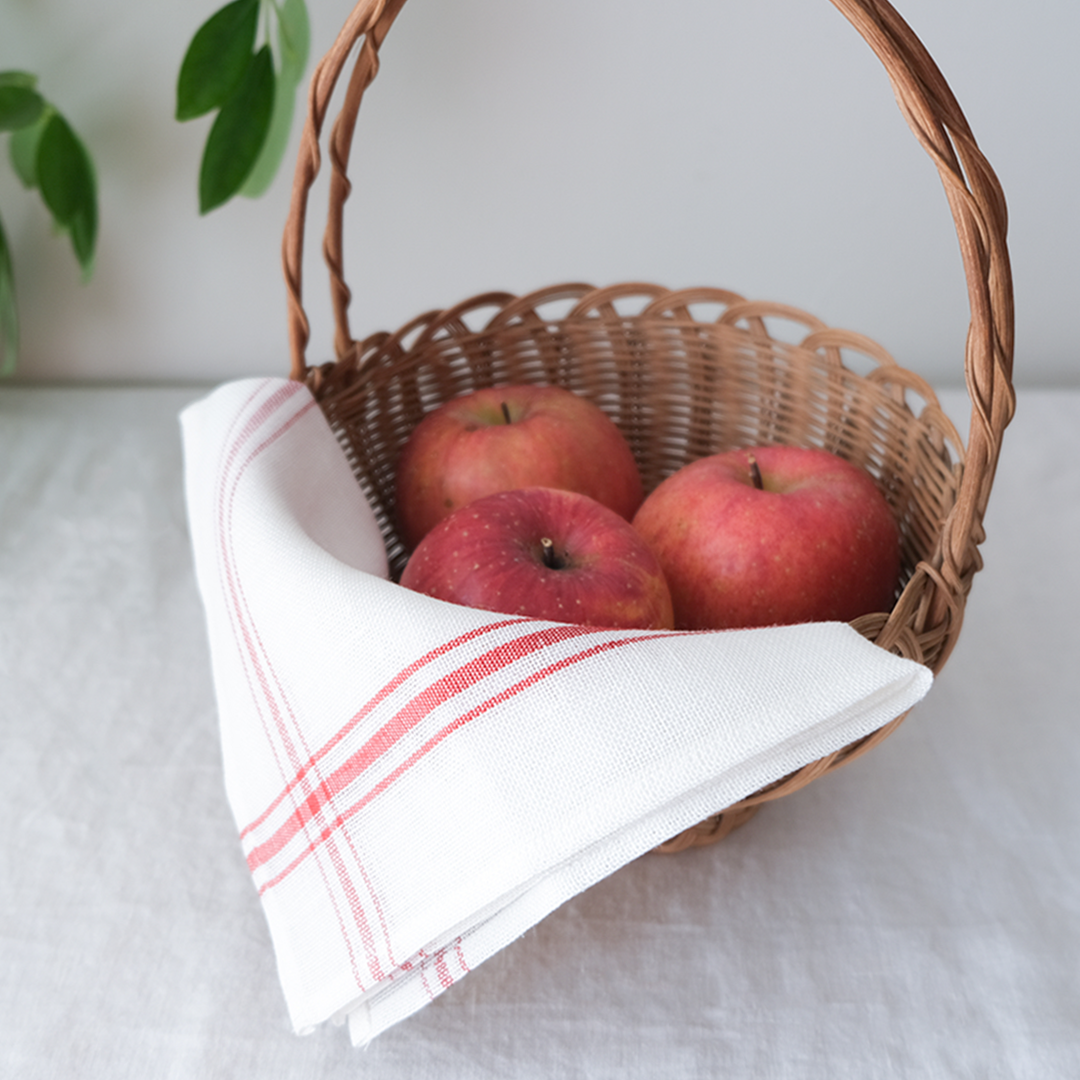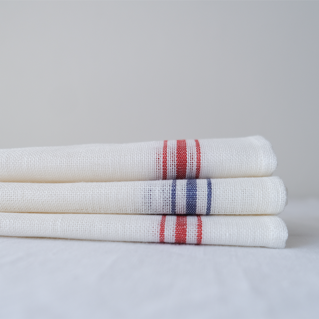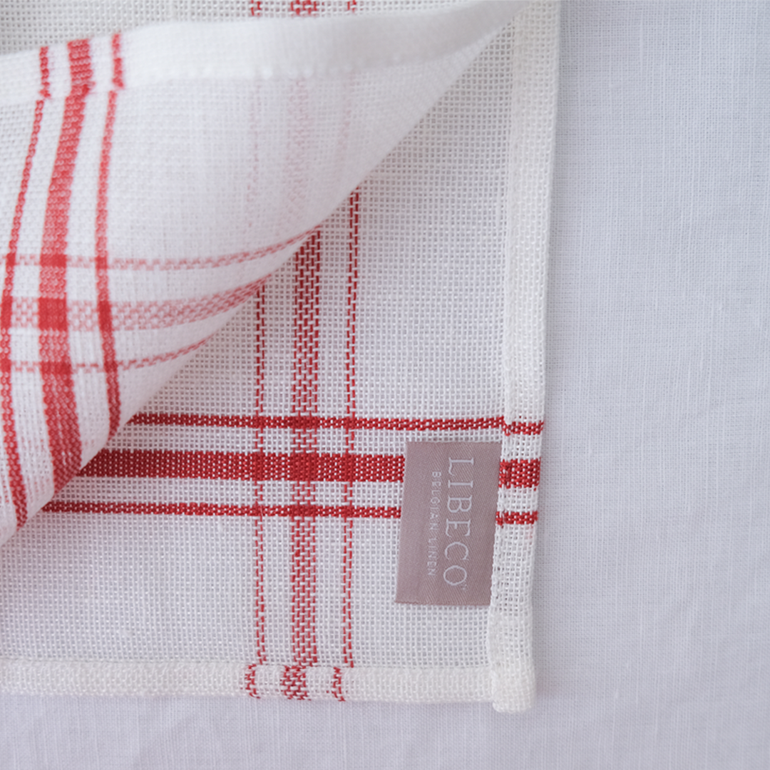 ベルギーリネンのブランドLIBECOの定番キッチンクロス「コンフィチュール」。コンフィチュールとはフランス語でジャムのことです。大判で目の粗い生地は、もともとはジャムを漉すときに使われていました。サイズは普通サイズと、こちらでご紹介しているミニサイズの2つ。小さいのがあったらいいなの声にこたえて、あとからミニをつくりました。普通サイズは赤だけですが、ミニサイズは赤ライン、青ラインの2色ご用意しています。