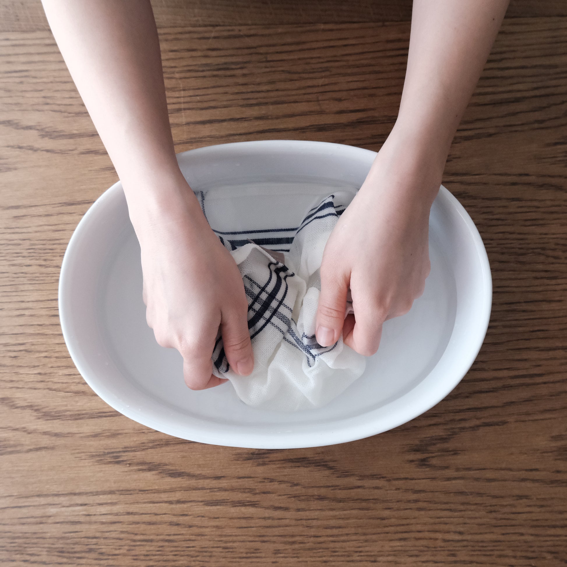 コンフィチュールミニは、初めは糊が付いていて水を吸えない状態。ぬるま湯で洗って糊を落とした後、さらに洗濯機にかけてからご使用ください。お洗濯を繰り返していくうちにだんだんと目が詰まり、ガーゼのように柔らかく軽い手触りになっていきます。▲ぬるま湯で、よくもみ洗いを。だんだん柔らかくなって、糊が落ちていくのがわかります