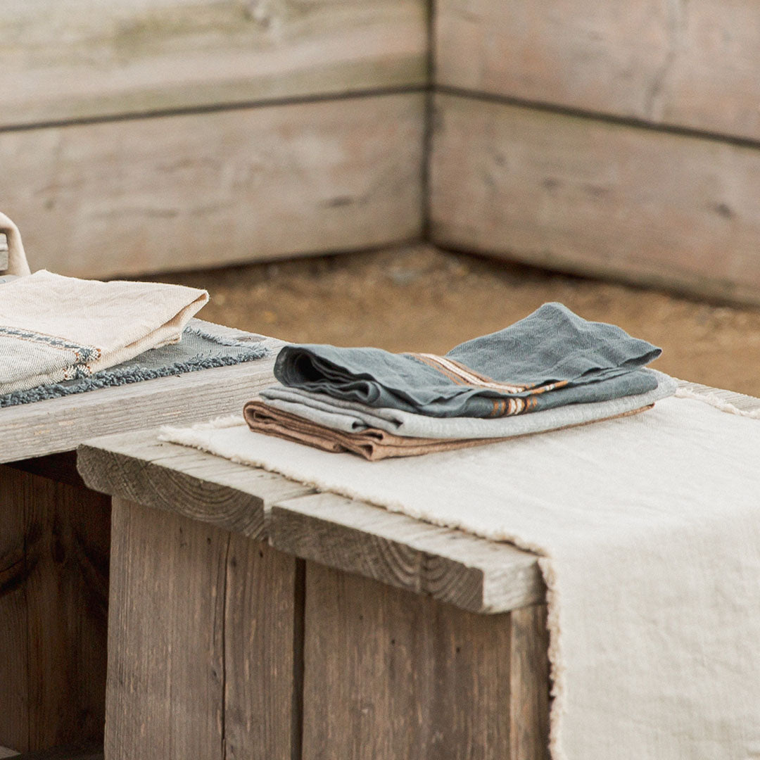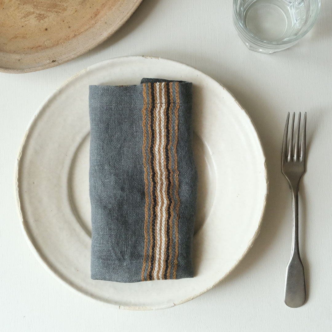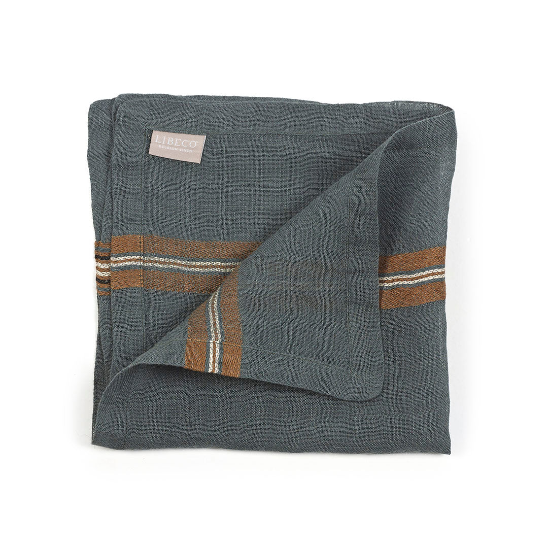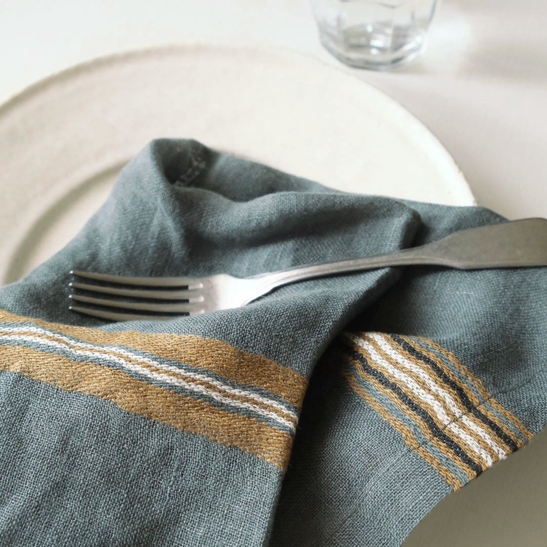 グレイッシュなブルーグリーンに、キャメルやオイスター色のラインが効いたLIBECOのナプキン「ケア」。洗いのかかったガーゼ生地は、使いはじめからふんわり柔らかな風合いです。いつもの食卓にセットするだけで、華やかなテーブルコーディネートになります。ふきんやお弁当包み、ハンカチとしてもおすすめです。